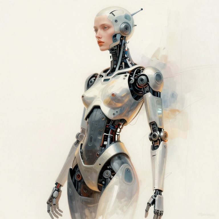 Digital portrait of a cybernetic woman with vibrant red hair, blue eyes, and metallic neck and shoulder armor, set against a gray background.