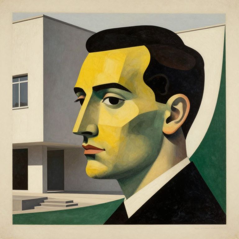 The image is a photorealistic collage in the style of Bauhaus, reminiscent of El Lissitzky's work. It features a man's head in profile, with geometric shapes and colors such as yellow, black, and green intersecting his face. The background includes a modernist building with clean lines and a staircase, suggesting a connection to architectural design. The overall composition is dynamic, with the man's head and the building interacting in a visually striking manner. The use of geometric shapes and muted colors creates a sense of harmony and balance, while the clean lines and precise forms reflect the principles of the Bauhaus movement.