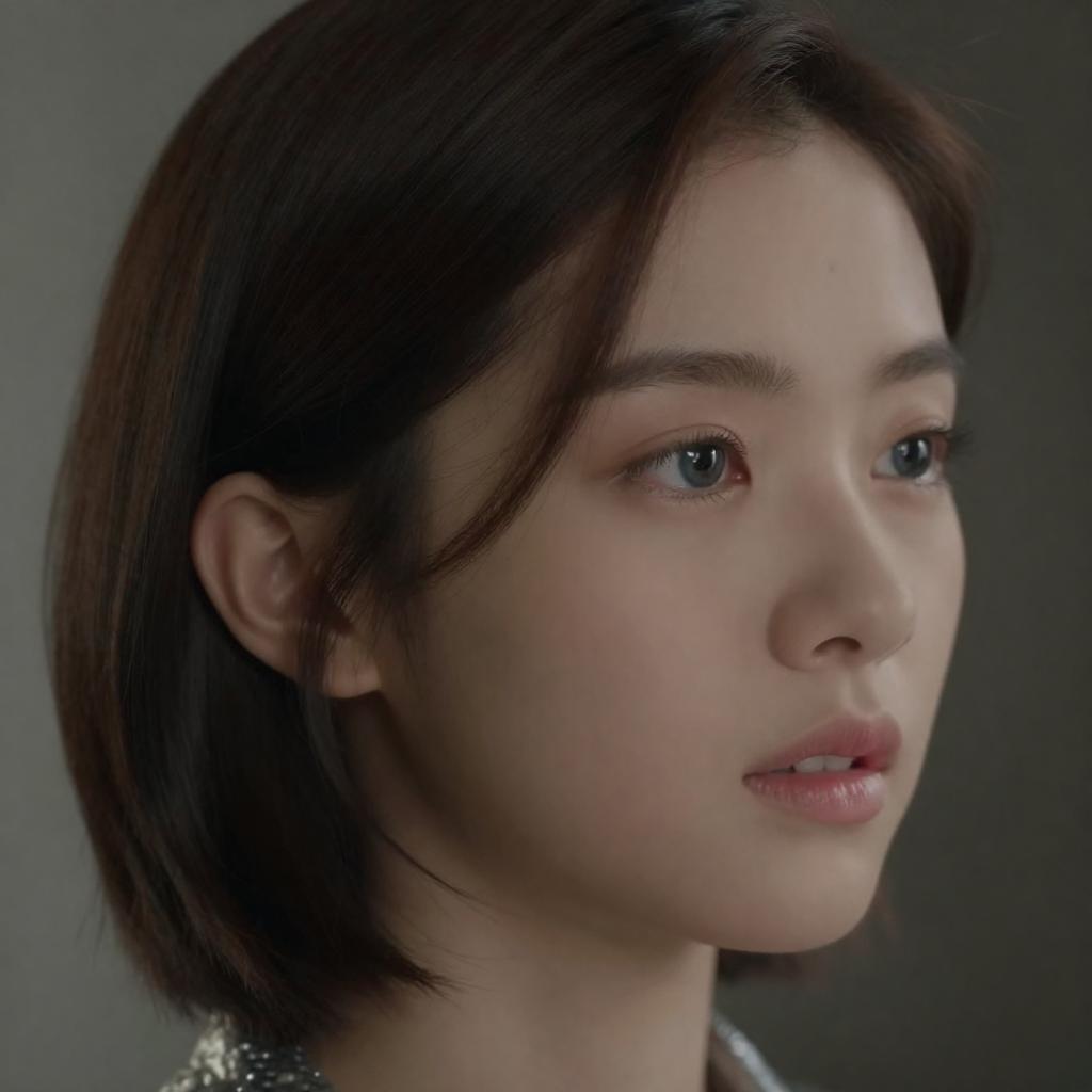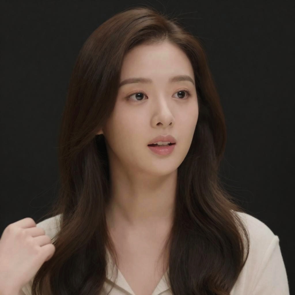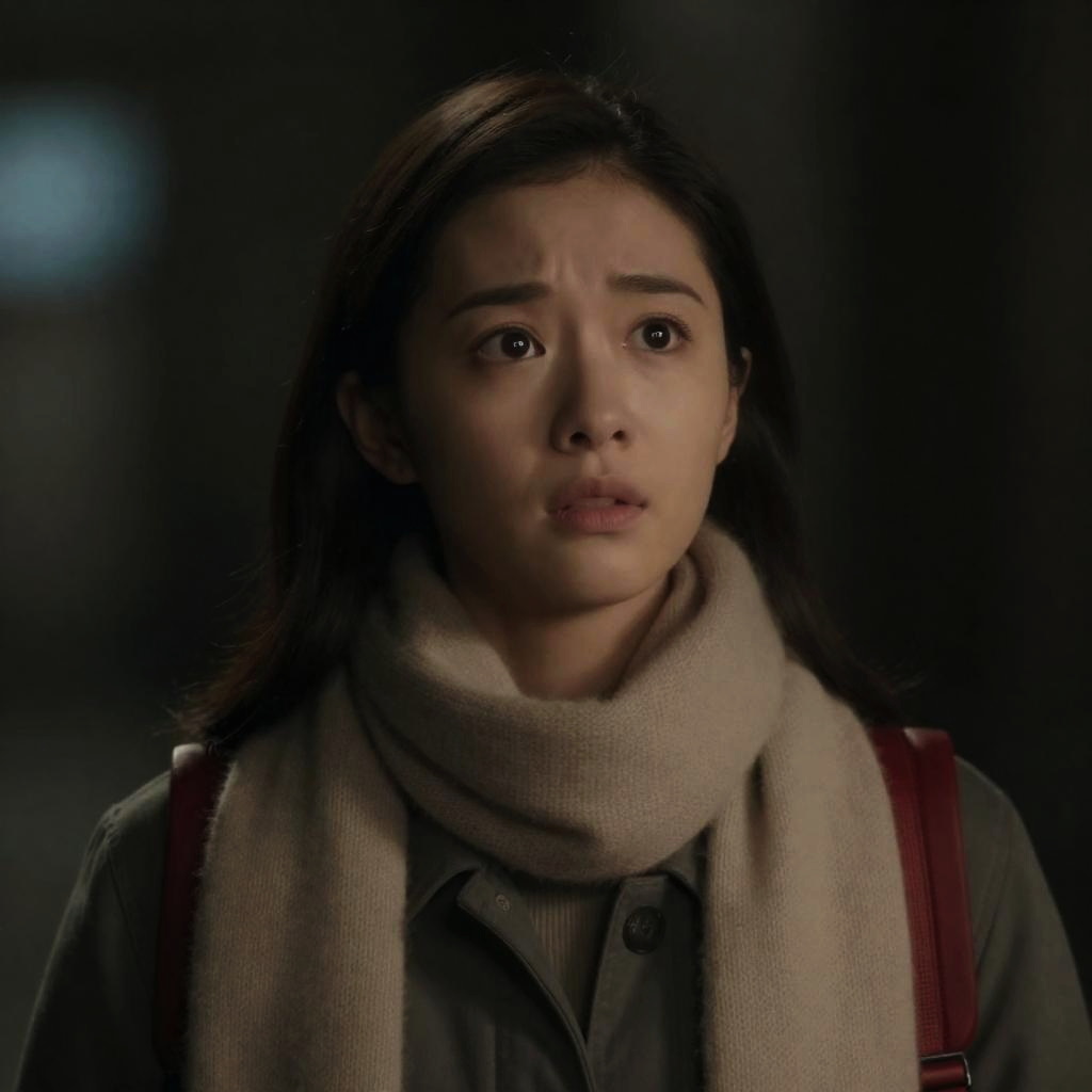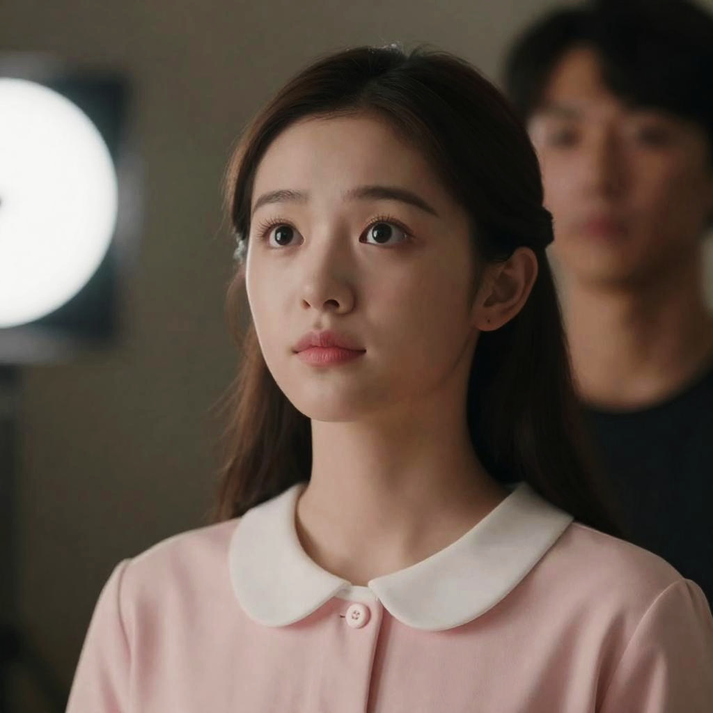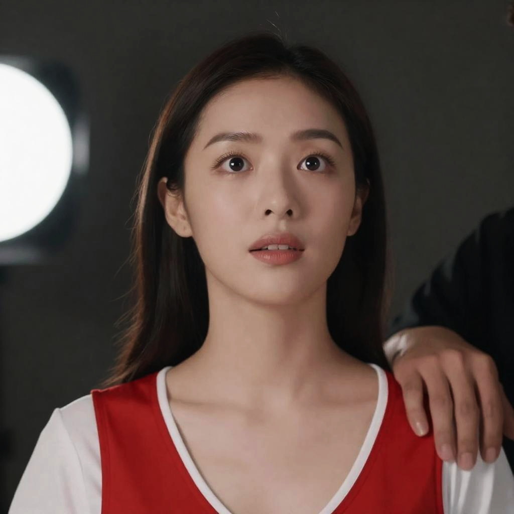 Photograph of a woman with dark hair and fair skin, wearing a red and white top, looking up with wide eyes. A man's arm rests on her shoulder from behind. Bright circular light on the left. Dark, indistinct background.