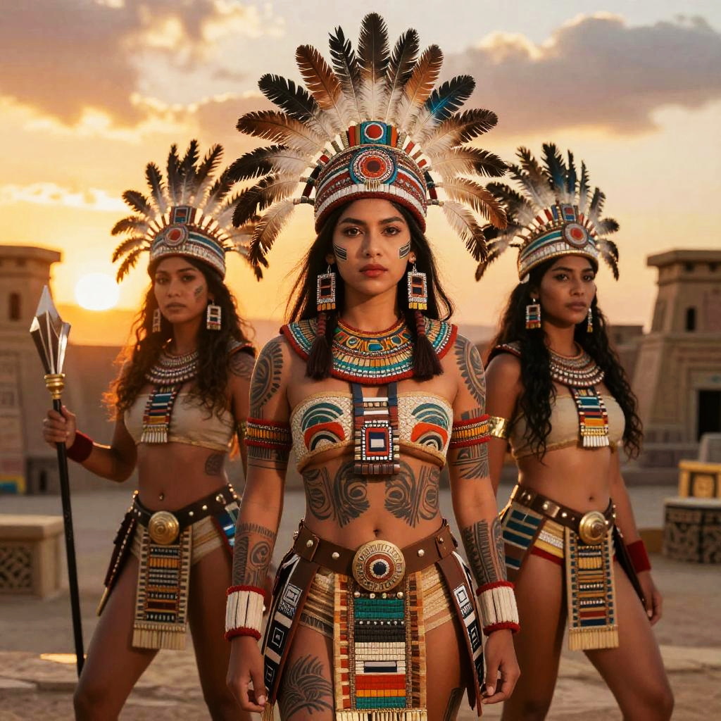 Aztec women warriors in mid-battle, muscles tense and expressions fierce, traditional Aztec patterns on clothing and skin, vibrant colors with stormy mountain terrain in background