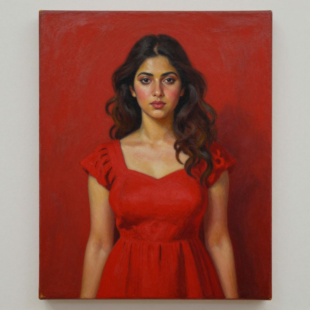 Digital painting of a South Asian woman with wavy dark hair, wearing a red dress, against a vibrant red background. She has a serious expression and