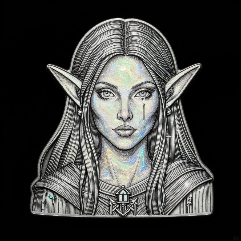 Digital black-and-white drawing of an elf woman with long hair, pointed ears, blood on her cheek, and a mysterious expression.