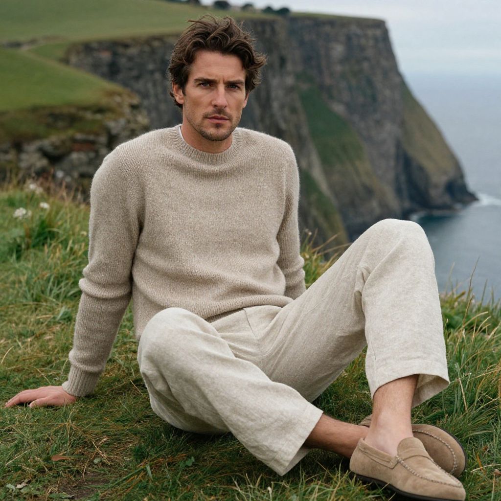 A man, beige knit sweater, relaxed beige linen trousers, tan suede loafers, soft knit texture, laid-back elegance, lush green cliffs, pinhole camera style, serene expression Man has masculine face and piercing eyes