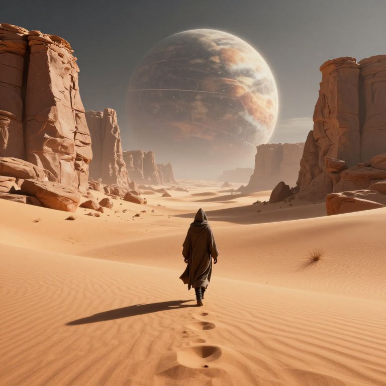 In a surreal 3D-rendered desert landscape, a lone figure in a hooded cloak traverses a vast expanse of shifting sands, surrounded by towering rock formations and colossal celestial bodies, evoking a cyberpunk-inspired vision of forgotten civilizations and impossible futures.