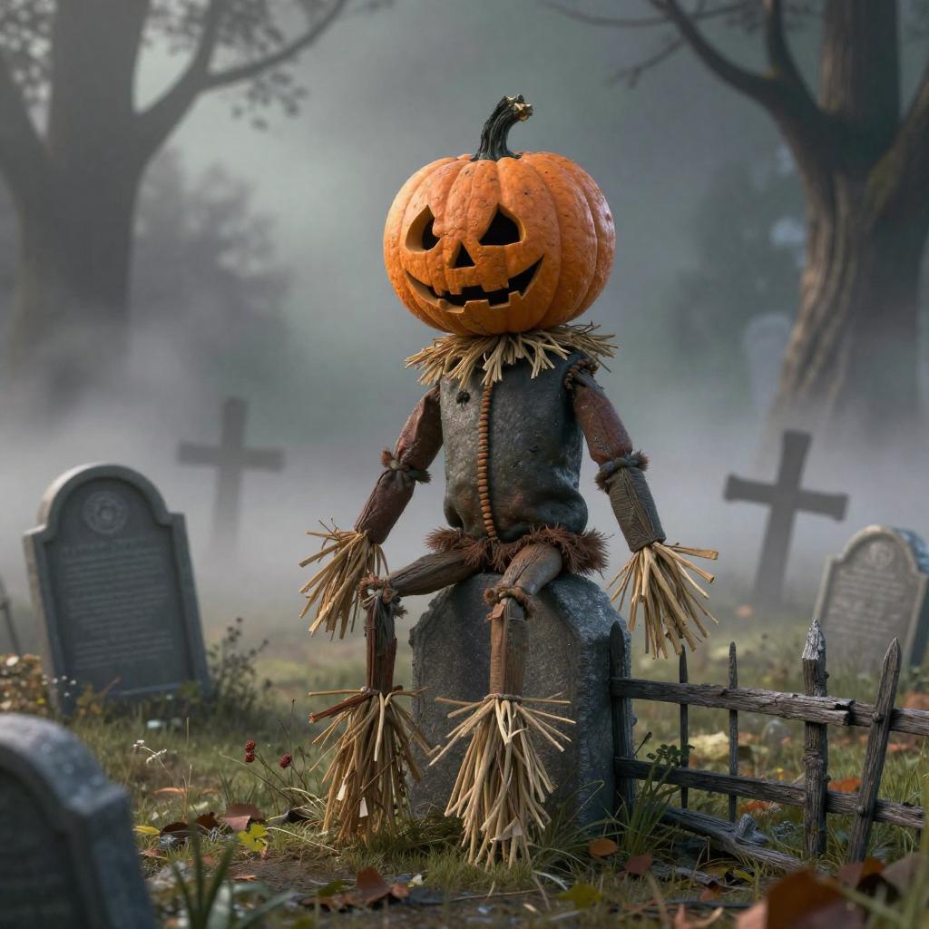 Realistic photo.Whimsical art style inspired by Tim Burton, Edward Gorey depicting a weary pumpkin-headed scarecrow sitting alone on a crooked gravestone in a misty graveyard, surrounded by swirling fog and a broken fence. realistic photo