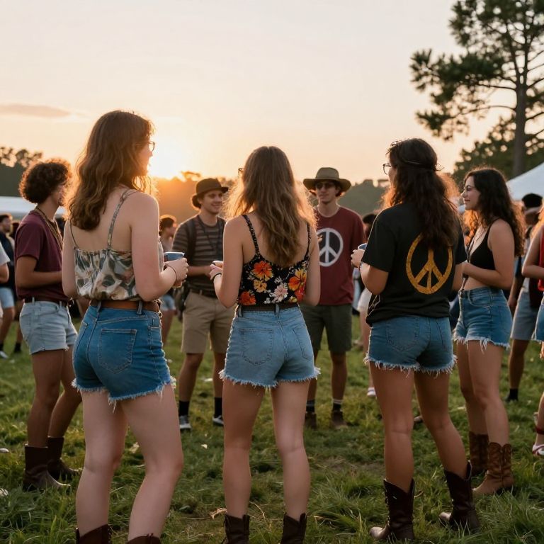 Photograph of young people at a sunset festival, wearing denim shorts, floral tops, and black tees with guitar designs, standing on grassy field