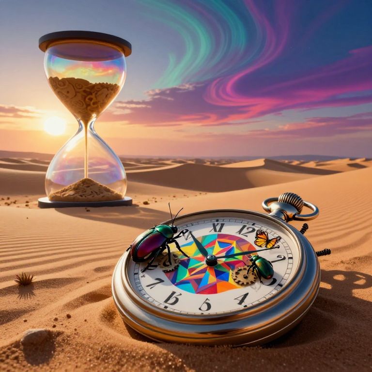 Craft an image in the mesmerizing surrealist style, portraying a dreamlike desert environment with timepieces resembling fruit drooping from the heavens. This scene should be viewed from a striking low-angle perspective, mirroring the gaze of a ground-crawling insect to intensify the otherworldly atmosphere and inspire feelings ranging from intrigue to amazement in the observer. This imaginative blend of Dalí-esque symbolism with an offbeat viewpoint should induce an emotional spectrum spanning curiosity to astonishment.