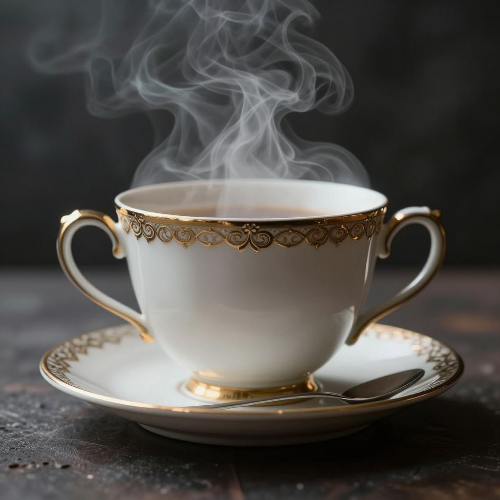 Photograph of a white, ornate teacup with gold trim and handles, steaming, on a matching saucer with a silver spoon,