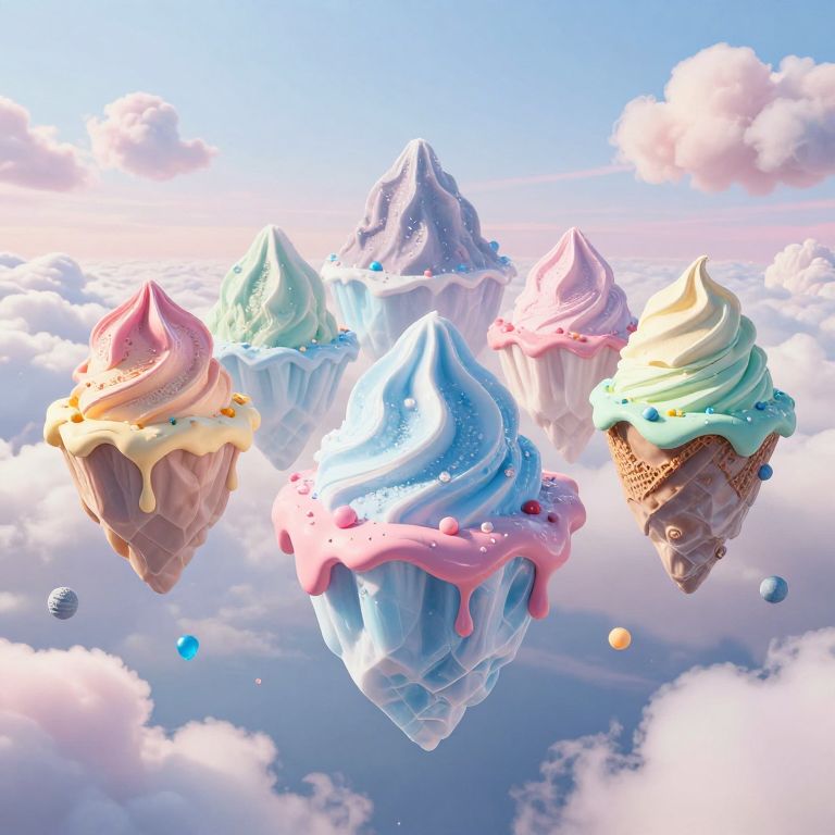 A surreal 3D-rendered archipelago of floating ice cream mountains, each peak adorned in vibrant pastel hues representing different flavors, drifts serenely through a dreamlike sky filled with fluffy, melting sugar clouds, creating a whimsical and fantastical visual experience.