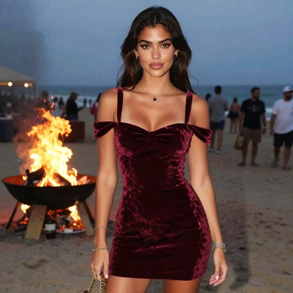 Photograph of a young woman with long, dark brown hair standing on a beach at dusk. She has a light olive skin tone and is wearing a tight, off-the-shoulder, burgundy velvet mini dress that accentuates her slim, hourglass figure and small to medium-sized breasts. She accessorizes with a delicate necklace, bracelet, and ring. In the background, there's a large, roaring bonfire to the left, with people gathered around and the ocean visible under the twilight sky. The sandy beach and distant blurry figures create a lively yet serene atmosphere. The woman's confident, direct gaze adds an assertive presence to the scene.