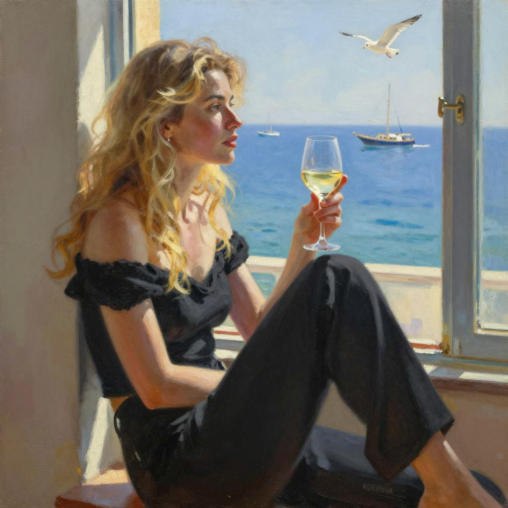 Painting of a woman with light brown hair in a bun, holding a glass of red wine, eyes closed. She is topless with visible breasts, light skin, sitting by a window. Painterly style with thick, ured brushstrokes. Sunlight streams in from the window on the right.