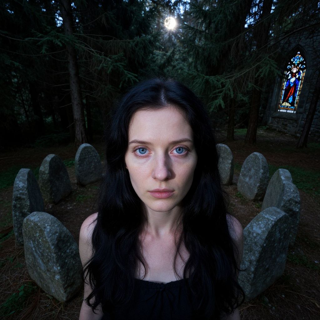 Photograph of a pale-skinned woman with long, black wavy hair and striking blue eyes, standing in a dimly lit forest cemetery. She wears a black top, and her expression is serious and slightly melancholic. Surrounding her are several gray, weathered tombstones, partially obscured by shadows. In the background, faint sunlight filters through tall pine trees, illuminating a colorful stained glass window on the right. The overall mood is eerie and somber, with a strong contrast between the dark forest and her bright eyes.