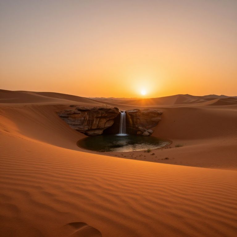 Camels traverse a sandy desert path flanked by towering reddish-orange rock formations, with six riders atop them, as a mesmerizing turquoise waterfall cascades downward from the sky, creating an ethereal and surreal landscape.