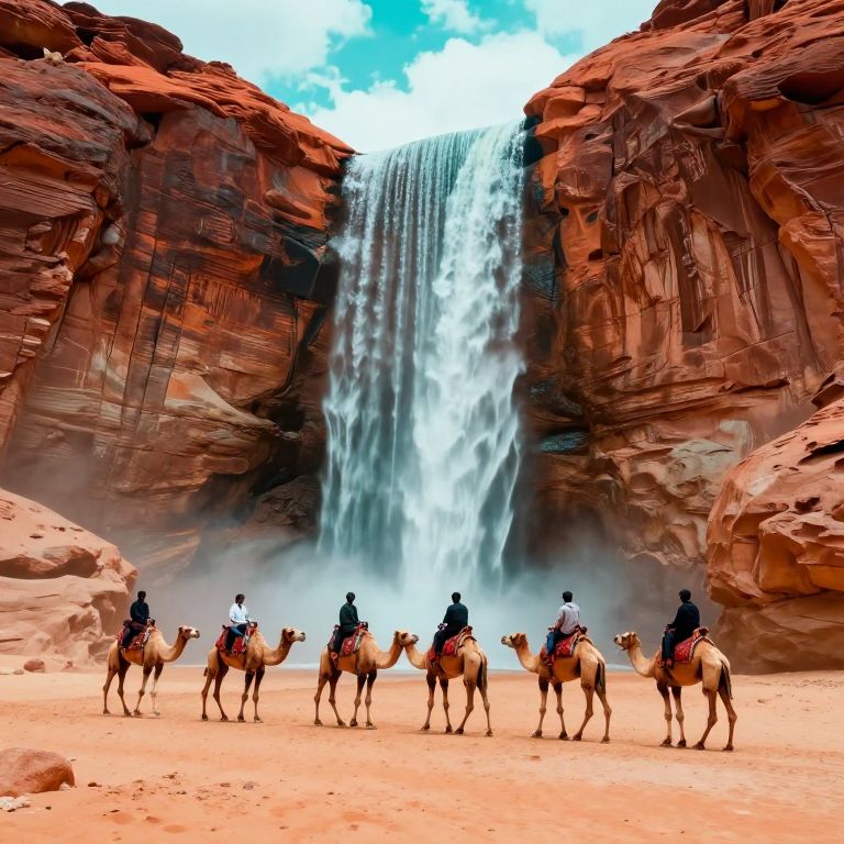 Photograph of a desert canyon with towering red rock cliffs. In the foreground, six camels are led by six riders dressed in traditional Middle Eastern attire, including white headscarves and dark robes. The camels are adorned with colorful saddles. A powerful waterfall cascades down the center of the canyon, creating a misty spray at the base. The sky above is bright blue with scattered clouds. The sandy ground is reddish-orange, contrasting with the dark, rugged cliffs and the white waterfall. The scene exudes a sense of adventure and natural beauty.