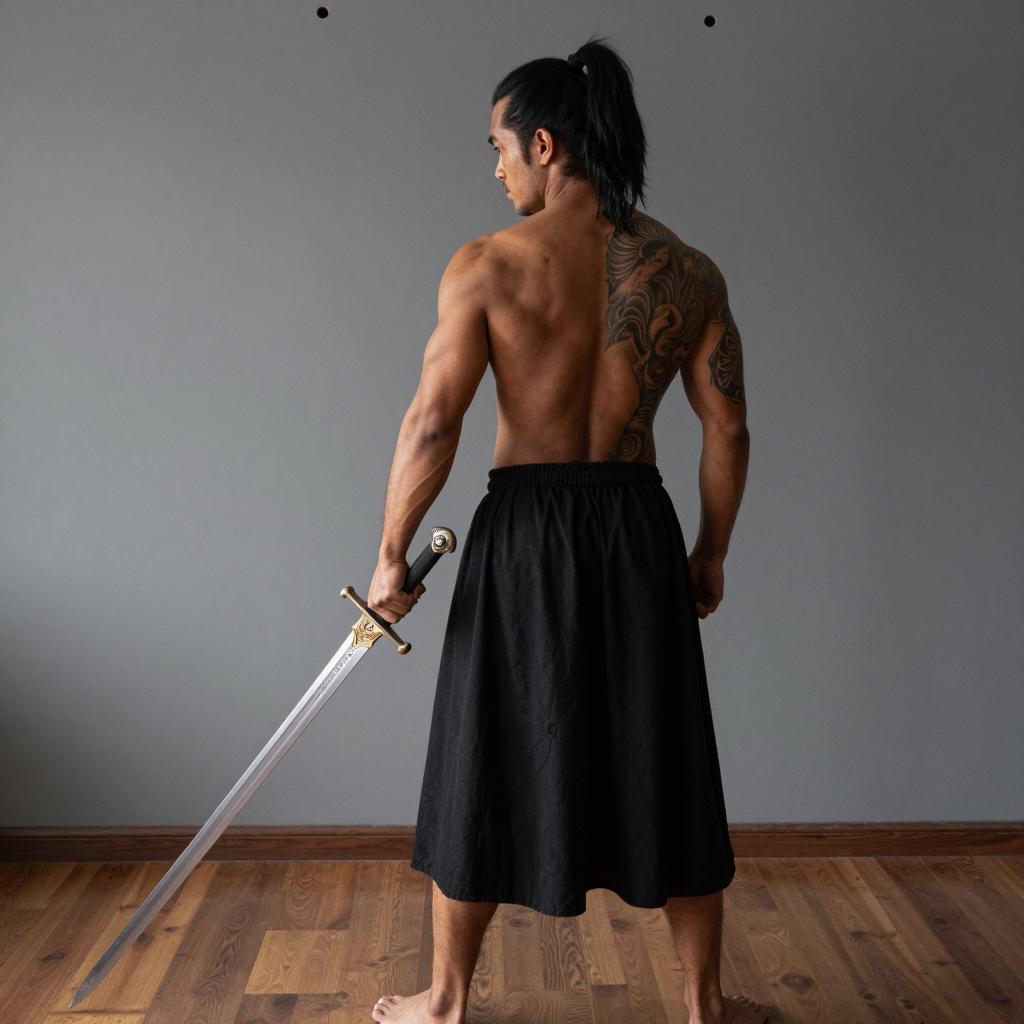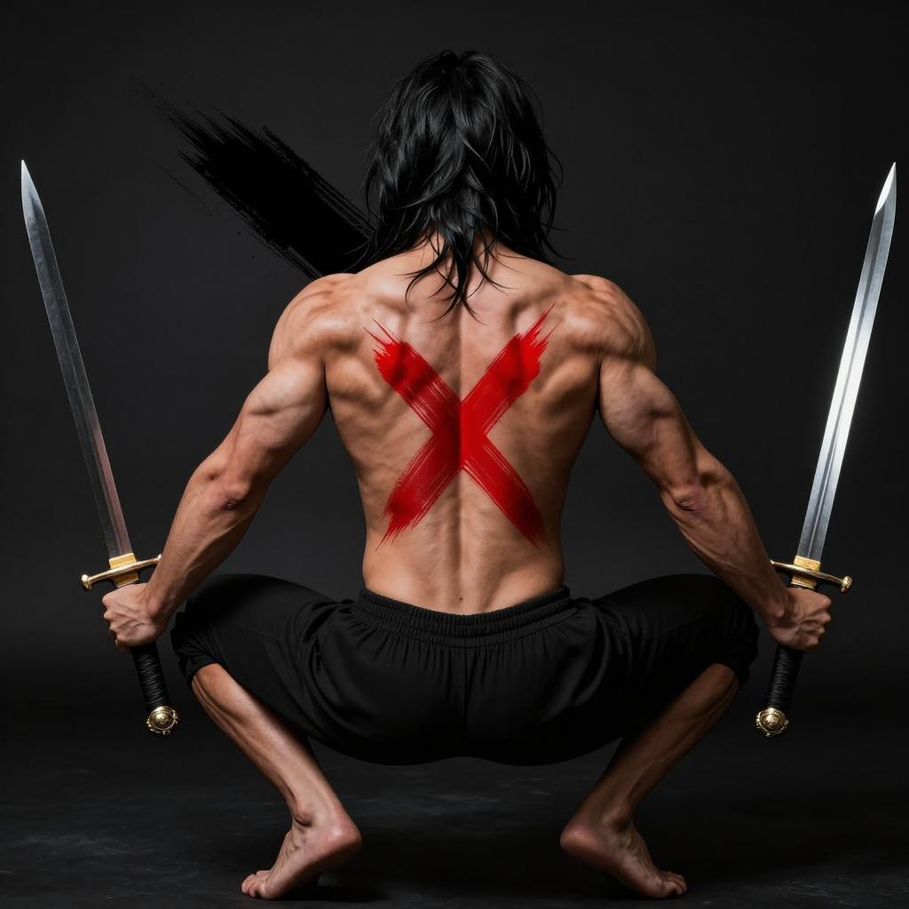 Muscular shirtless man with long black hair crouched facing away from the viewer, holding two swords with black and red brushstroke tattoos on his back. The photo features a black background and highlights the man's strong physique and intense pose.