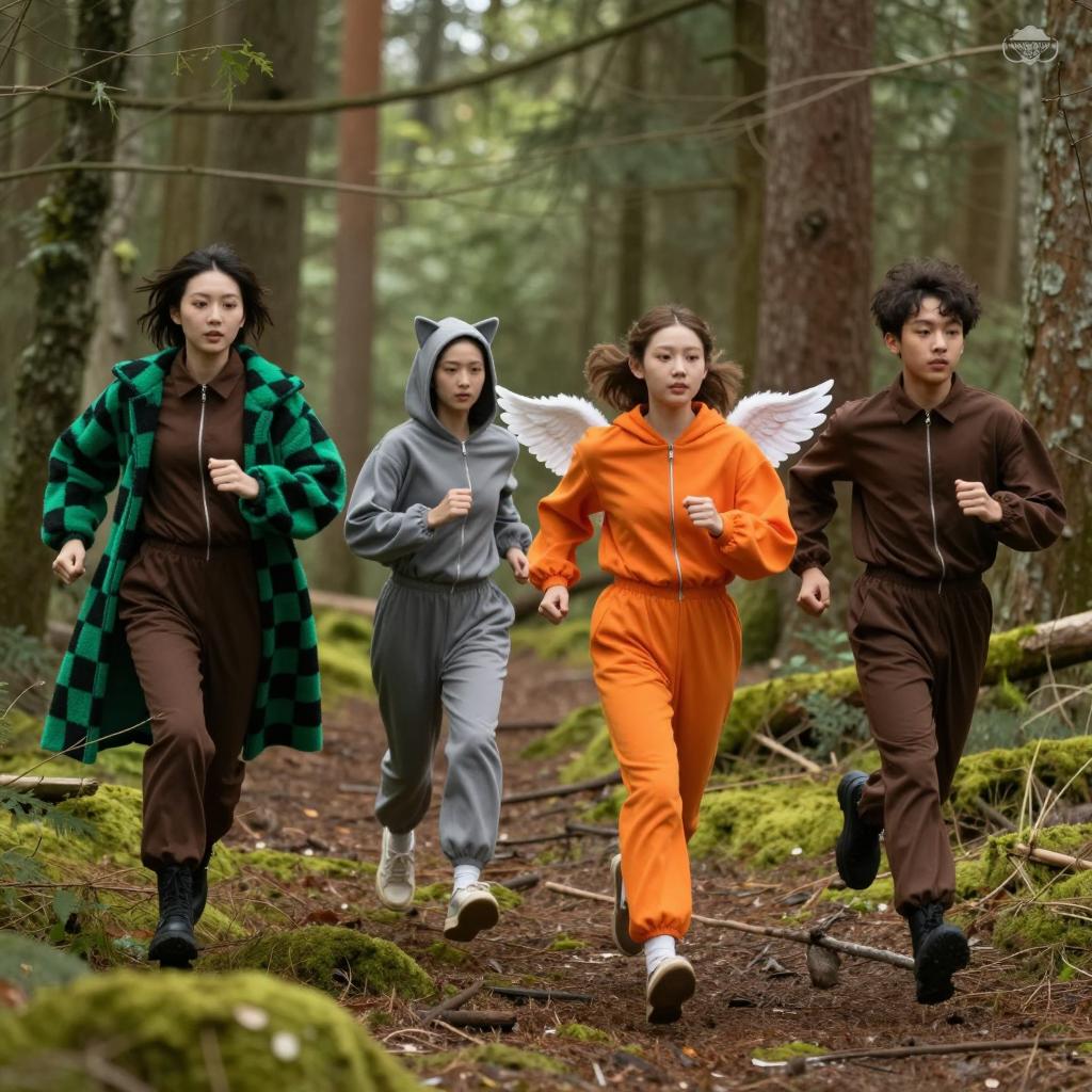 Black and white photograph of four young men with medium-length hair wearing dark suits and ties running alongside a passenger train. The first man leans against the train, while the second man holds his arm. The third and fourth men follow closely behind on a grassy path bordered by trees. All men are smiling and appear joyful.