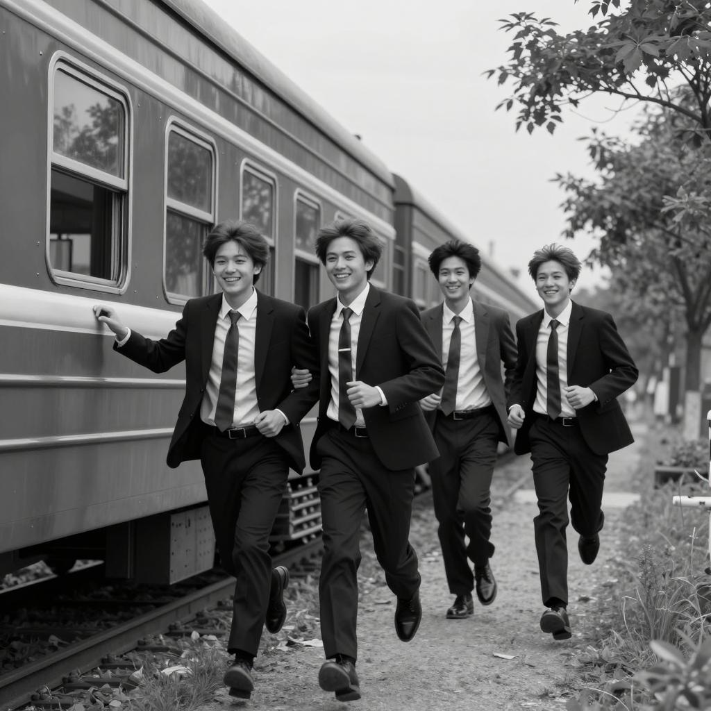 Black and white photograph of four young men in suits and ties running alongside a train. First man leans into train, second man grabs his arm, third man follows closely, fourth man trails behind. Train on left, grassy path and trees on right. All men have medium-length hair, smiling. Train window on left side.