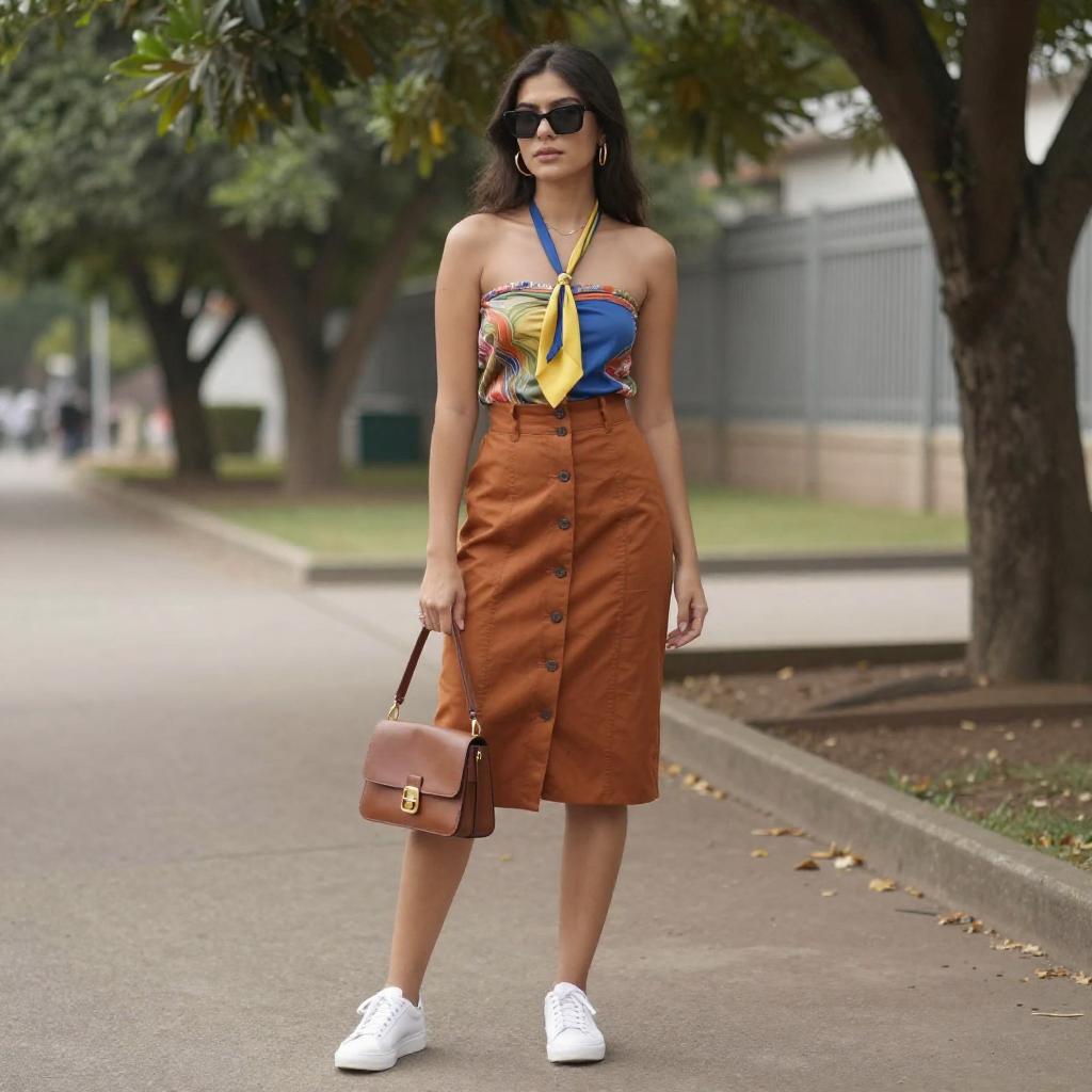 Photograph of a young woman with long dark hair, wearing sunglasses, a colorful strapless bandeau top with a yellow and blue tie, and a rust-colored, buttoned, high-waisted skirt. She holds a brown leather handbag and wears white sneakers. She stands on a concrete path under a tree, with greenery and a fence in the background.