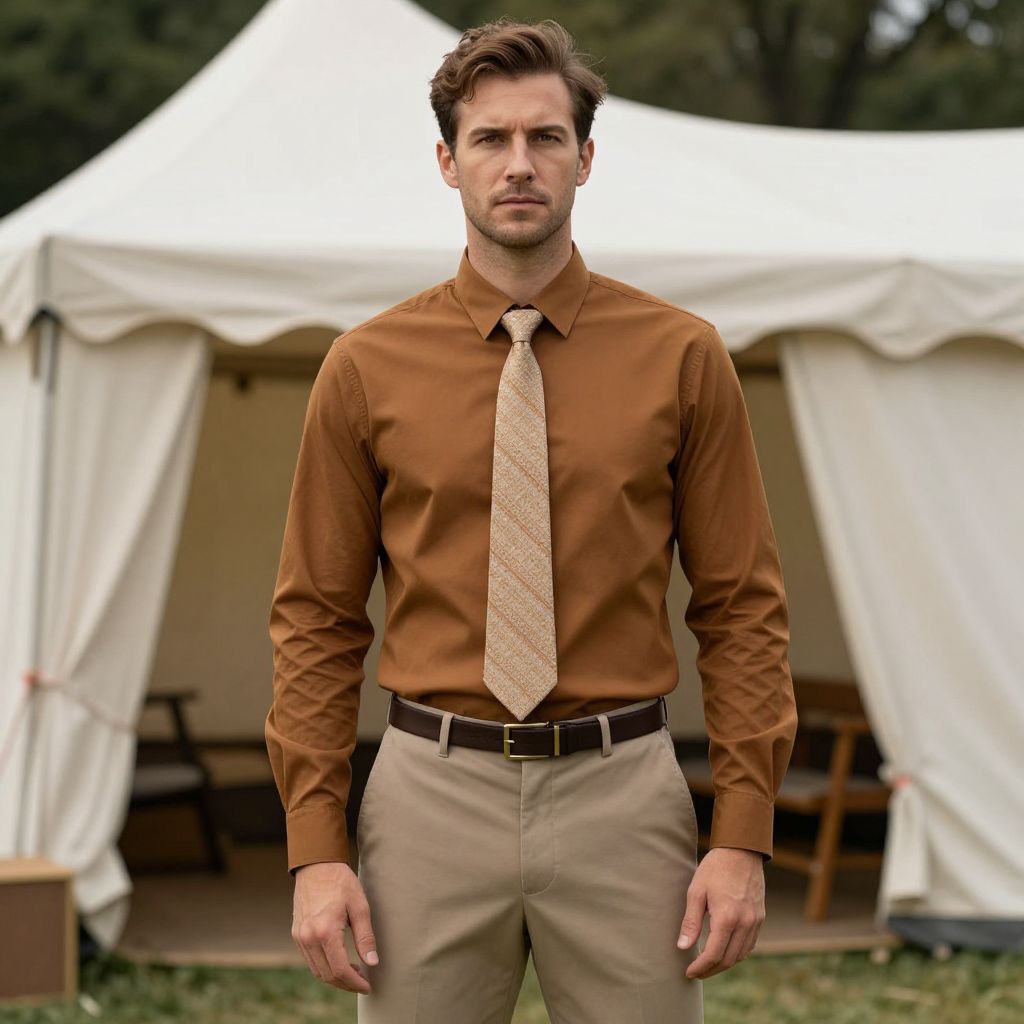 Photograph of a handsome white man in his late 20s to early 30s with short, dark brown hair and light stubble. He wears a brown long-sleeved dress shirt, beige tie with a subtle pattern, and beige pants with a black belt. He stands confidently in front of two white tents with open flaps, showing a blurred interior with wooden tables. The background includes green grass and trees, suggesting an outdoor setting. The lighting is natural, highlighting his serious expression and well-groomed appearance.