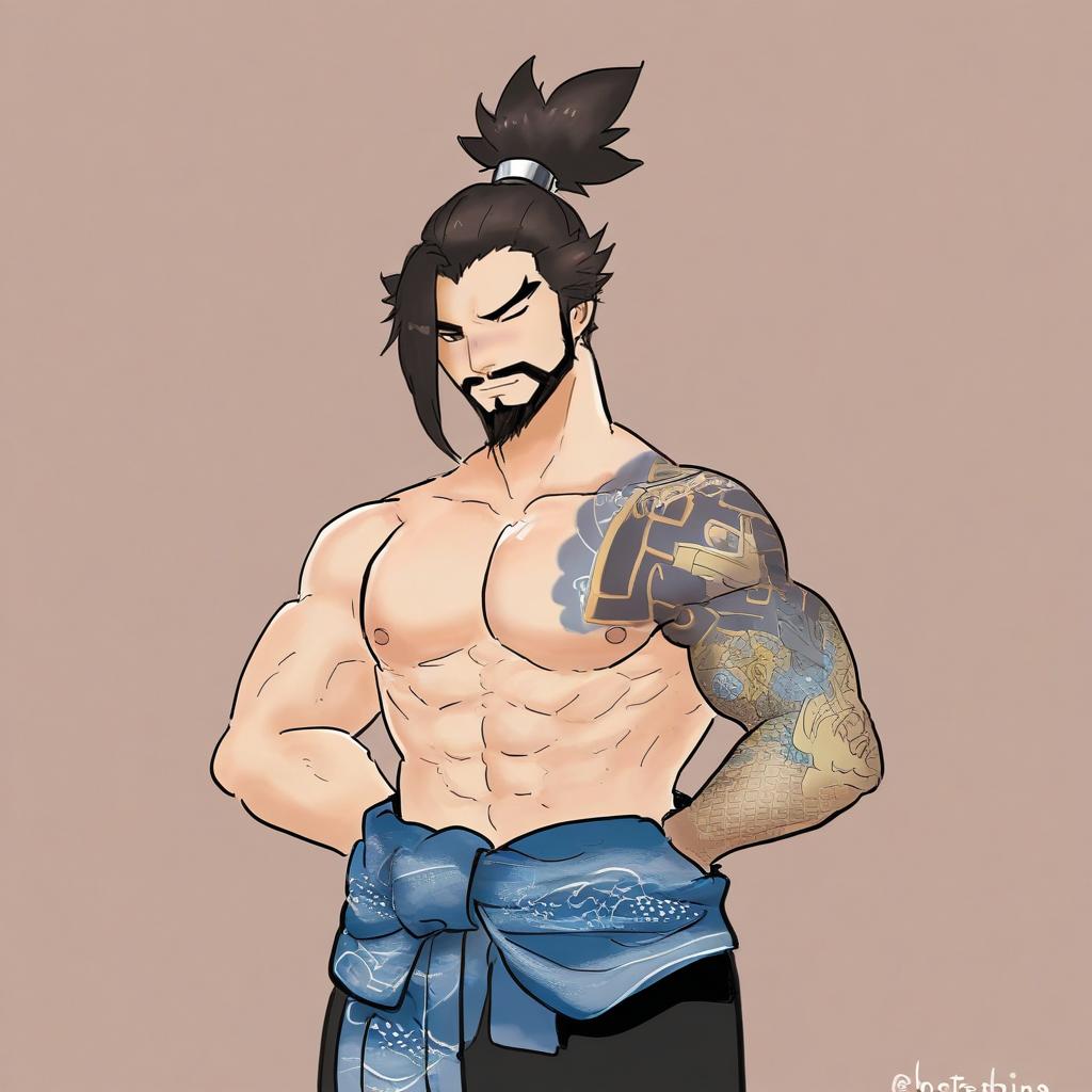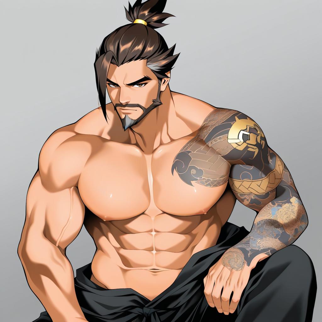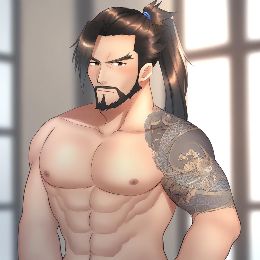 Hanzo (overwatch), overwatch, 1boy, mature male, beard, black hair, long hair, short hair, brown hair, ponytail, nipples, arm tattoo, muscular male, bara, large pectorals, abs, by artist racer (magnet), illustrious