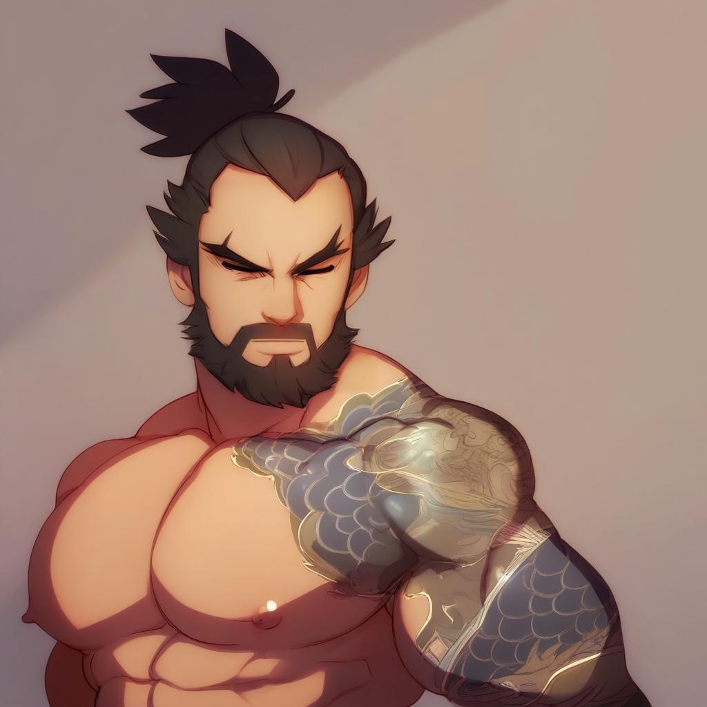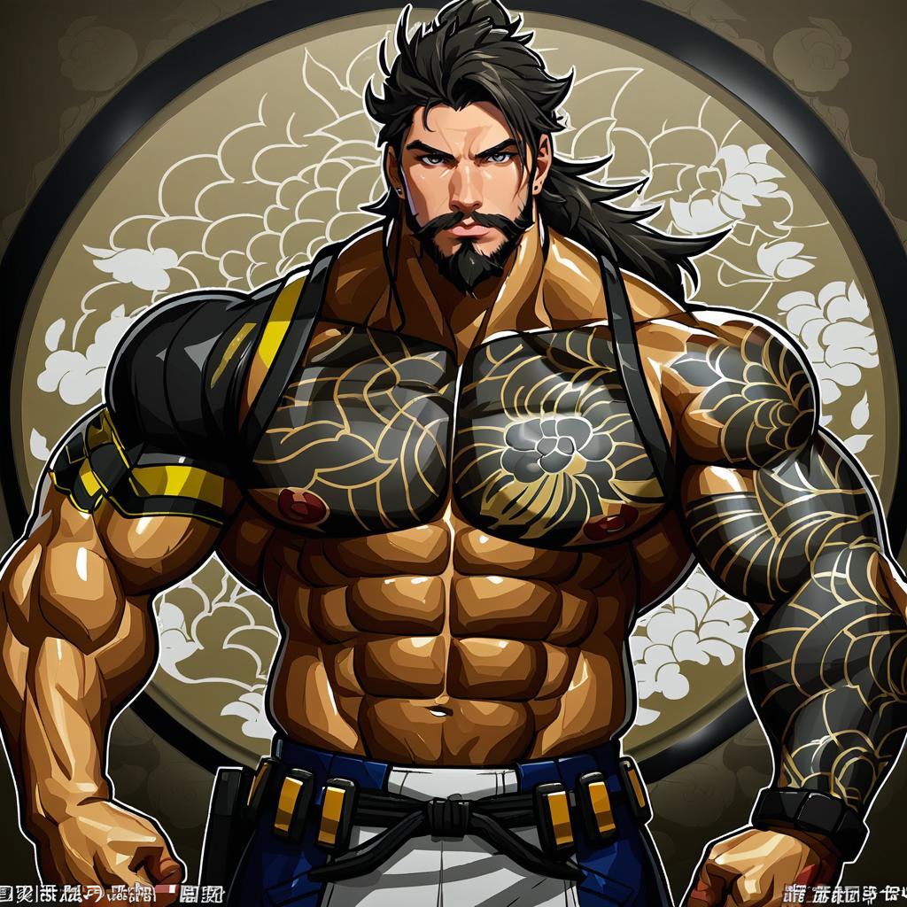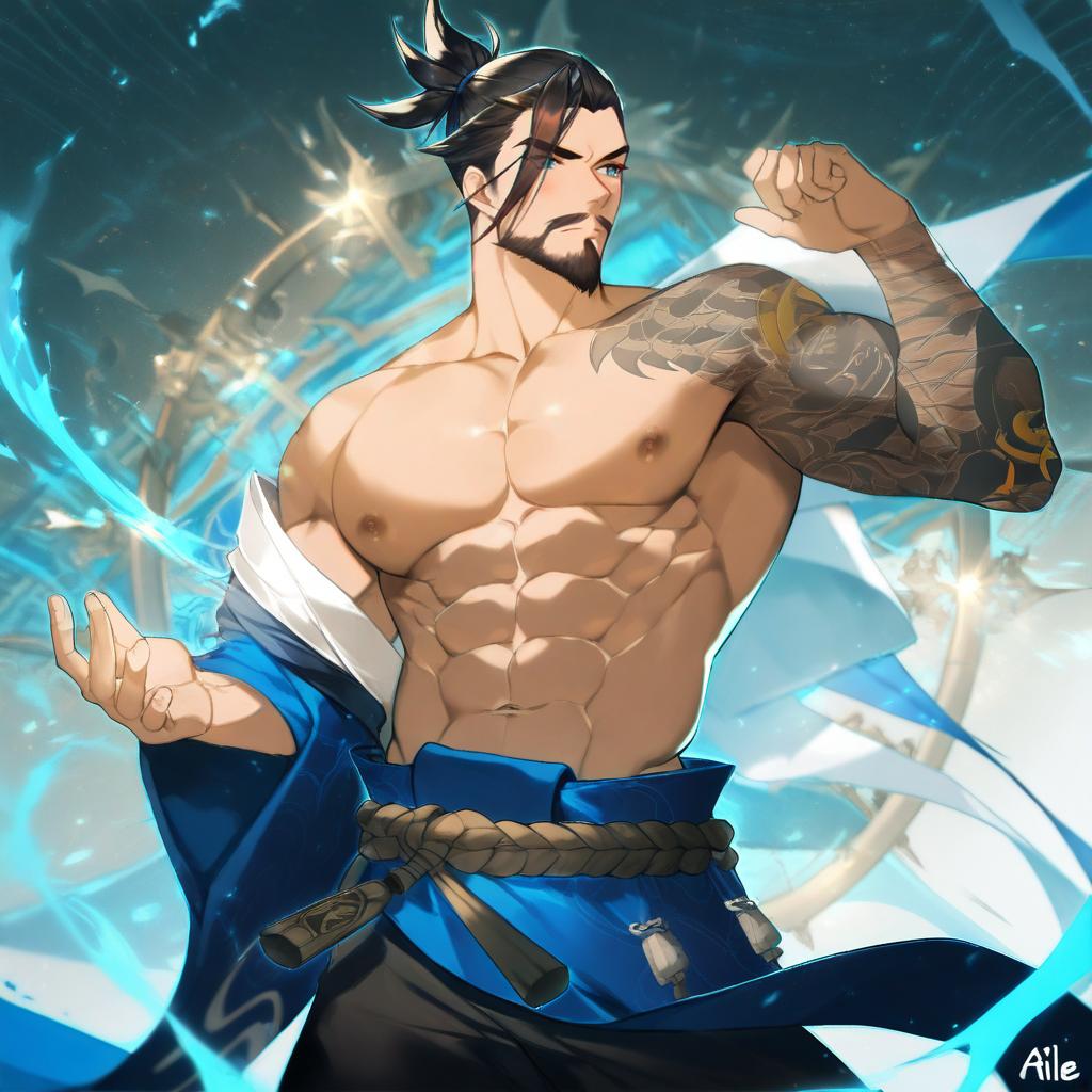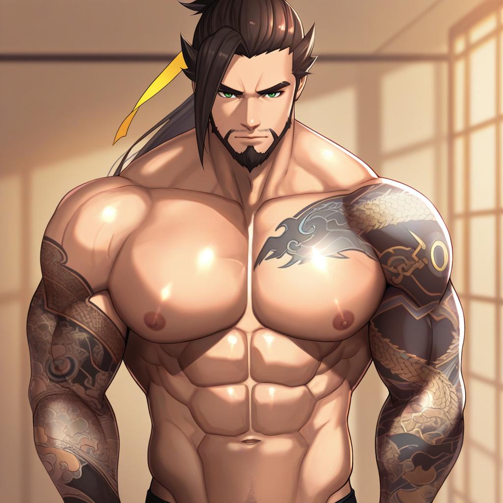 Hanzo (overwatch), overwatch, 1boy, mature male, beard, black hair, long hair, short hair, brown hair, ponytail, nipples, arm tattoo, muscular male, bara, large pectorals, abs, by artist racer (magnet), illustrious