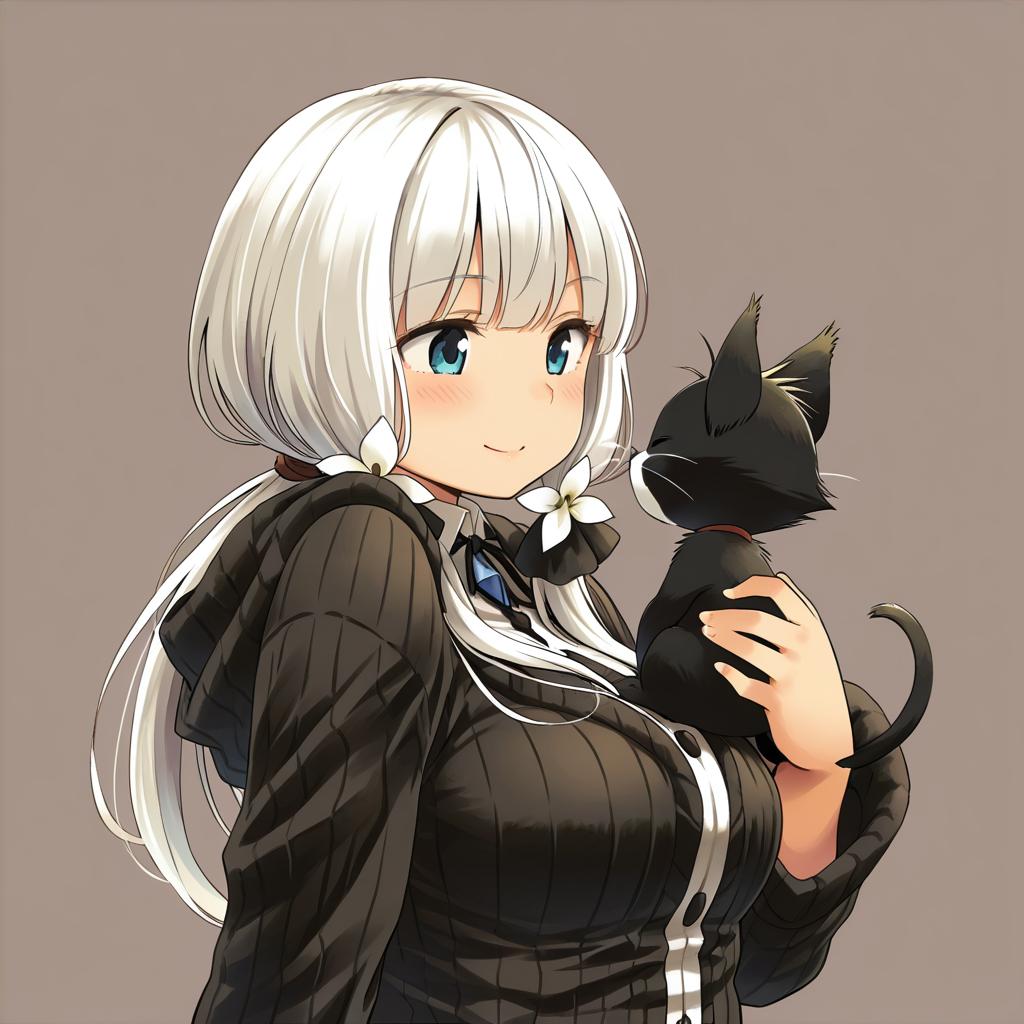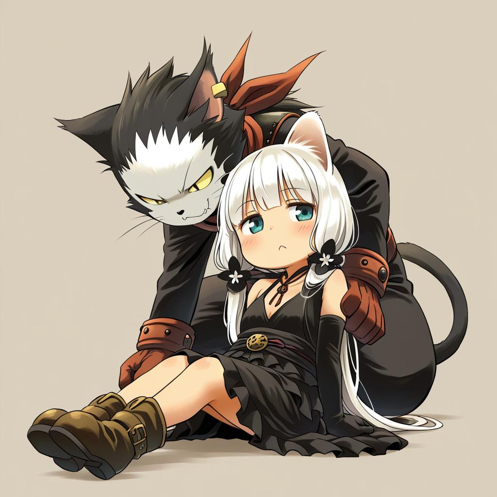 Digital anime-style illustration featuring two characters inspired by Final Fantasy's Cait Sith. One character is a humanoid cat with black and white fur, yellow eyes, and a red scarf, while the other is a young girl with white hair, blue eyes, cat ears, and dressed in a black dress with matching gloves and boots. Both characters have a fantasy-inspired look with detailed clothing and accessories, set against a neutral background.