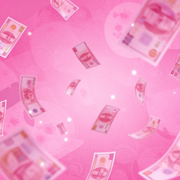 Digital artwork of floating pink money bills against a bright pink, circular, glowing background with blurred money patterns in the corners.