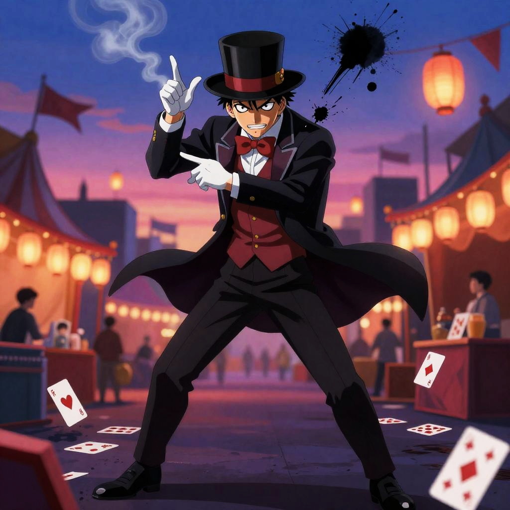 Dynamic illustration of a confident street magician wearing a black top hat, white gloves, a dark tailcoat, and a red vest. The scene is set during twilight in a bustling rooftop carnival illuminated by flickering paper lanterns and colorful tattered banners. Playing cards are scattered around the magician, with drifting smoke and ink-splatter effects adding to the dramatic atmosphere. The background shows blurred silhouettes of carnival visitors and city buildings.