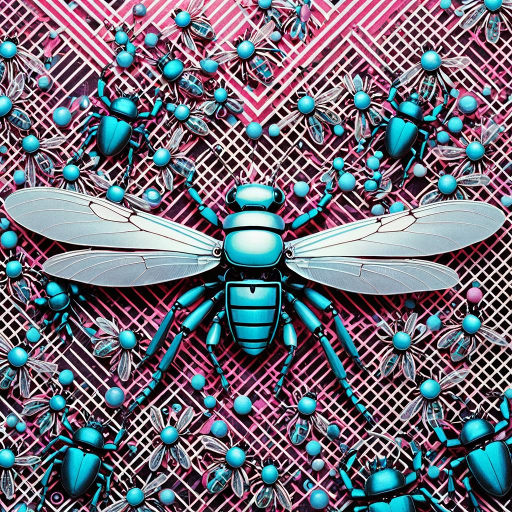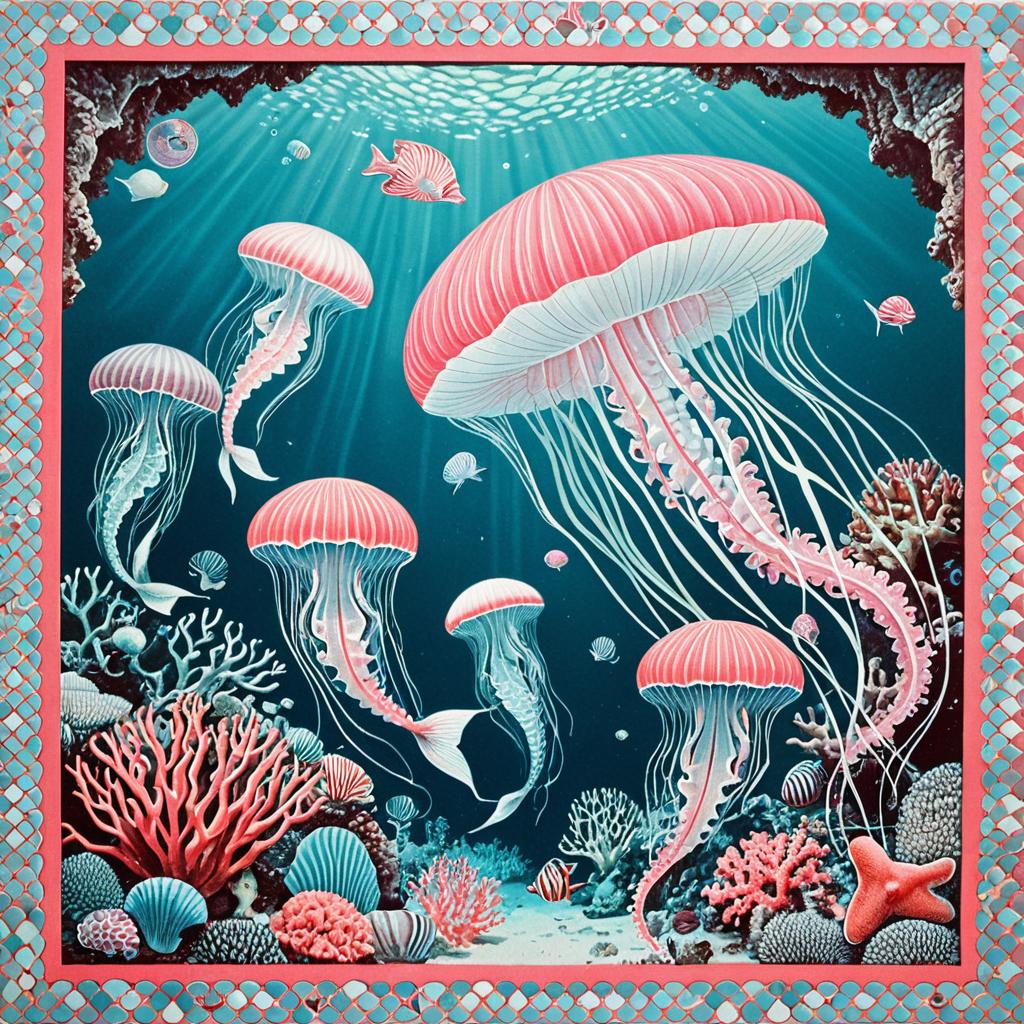 An extremely hyperrealistic weird surreal vintage analog retro psychedelic collage of an optical illusion pattern created using the colors bubblegum pinks, baby blues, cream, translucent, and metallic silver. octopuses, kaleidoscopic grids