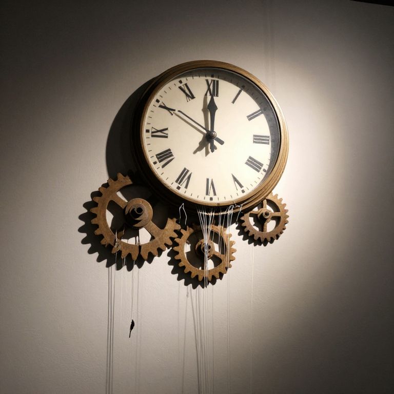 A towering clock with melting gears casts shadows that dance backward on a wall, each tick unraveling time like threads from a loom.