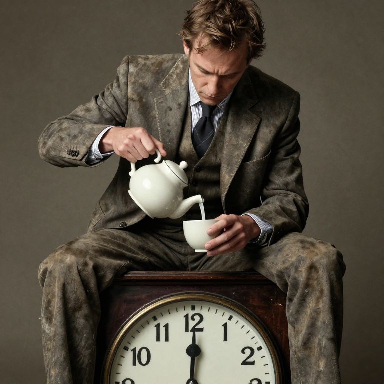 A timekeeper in a moth-eaten suit sits on a clock with no hands, feeding minutes into a teapot that never empties.