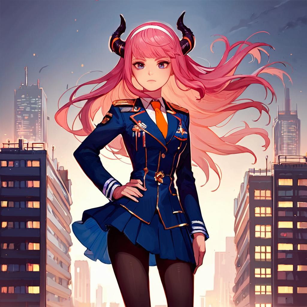Illustration of a confident anime girl with long pink hair and horns, wearing a blue uniform dress with orange accents and a red tie, standing against a city skyline at dusk. The character has a striking, determined expression and black tights.