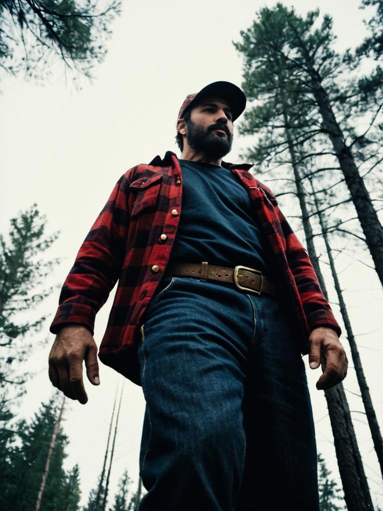Man in Lumberjack Costume, cinematic realism, dramatic low-angle photo