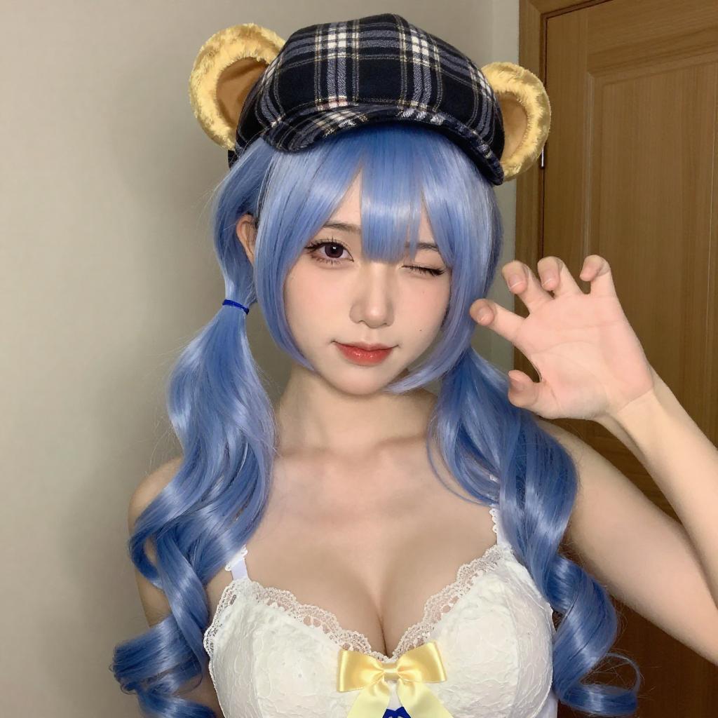 Photograph of an Asian woman with light blue, wavy hair in pigtails, wearing a black plaid hat with gold bear ears, and a white lace bra with a yellow bow. She has fair skin, red lipstick, and is winking while making a playful hand gesture. Background includes wooden panels and soft lighting.