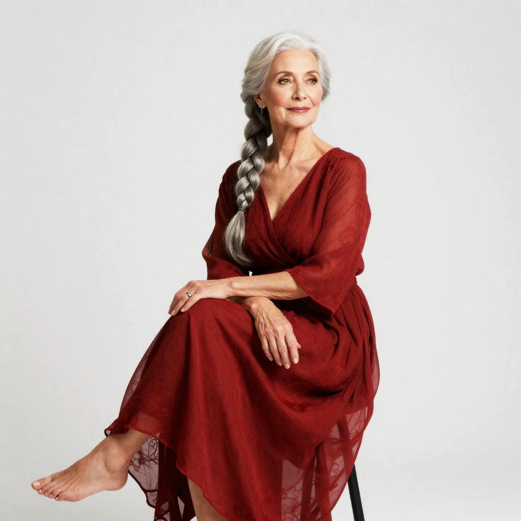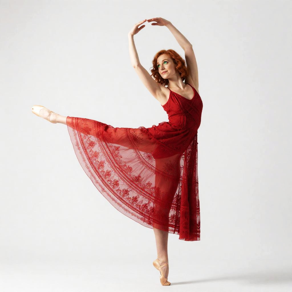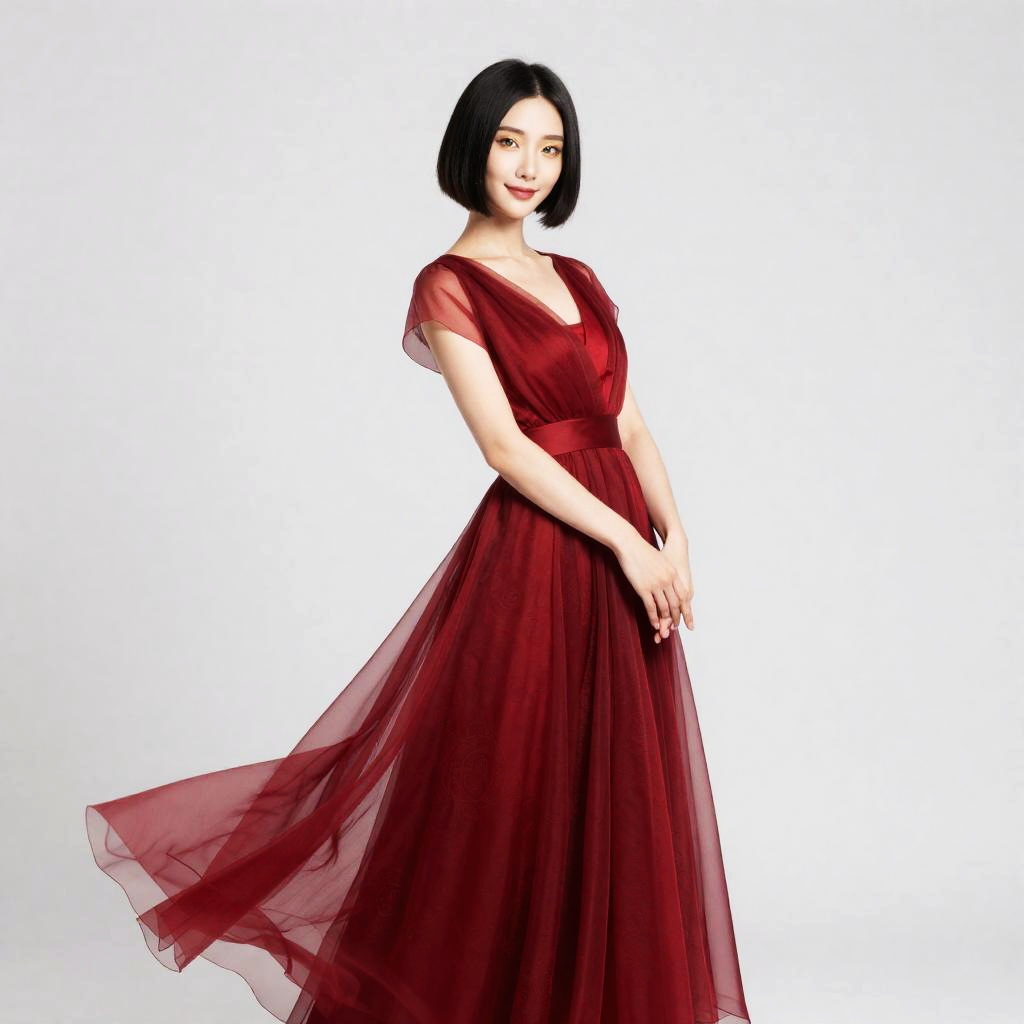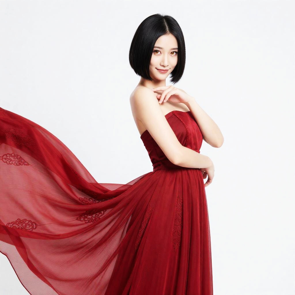 Full-body portrait of a petite East Asian woman with waist-length black hair and porcelain skin, wearing an elegant red dress with intricate patterns and delicate, flowing fabric. She is barefoot, walking forward with a graceful posture, lifting one side of the dress, which billows around her. The woman has warm amber eyes and a joyful expression, set against a plain white background.