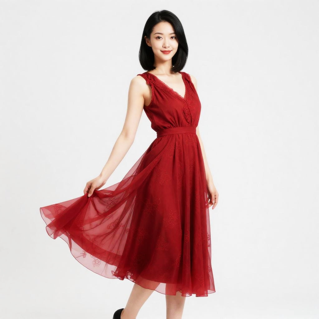 Full body, 1girl, solo, petite East Asian woman with waist-length raven hair, porcelain skin and warm amber eyes, red dress, elegant, delicate fabric, flowing dress, intricate patterns, graceful posture, walking forward with the dress billowing and one hand lifting the hem, joyful laughter, white background