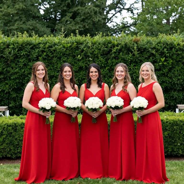Photograph of six women standing in a row outdoors, wearing floor-length, sleeveless red dresses. They each hold a bouquet of white flowers. From left to right, the women have light brown, black, dark brown, black, light brown, and blonde hair. They are smiling and standing in front of a lush green hedge with trees in the background. The grass beneath them is green and well-maintained. The image has a bright, sunny atmosphere with vivid colors, emphasizing the red dresses and white flowers.