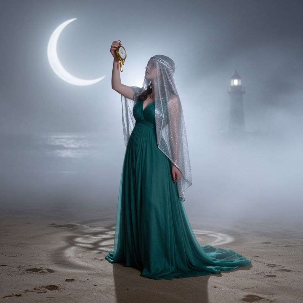 Photograph of a woman standing on a misty beach at night, wearing a flowing, dark teal gown with a sheer, silver veil. She holds an antique pocket watch up to a glowing crescent moon in the foggy sky. A lighthouse is faintly visible in the background. The ground beneath her has a circular pattern. The moonlight casts a soft, ethereal glow on her, highlighting her pale skin and long, dark hair. The overall mood is mysterious and magical, with a sense of timelessness.