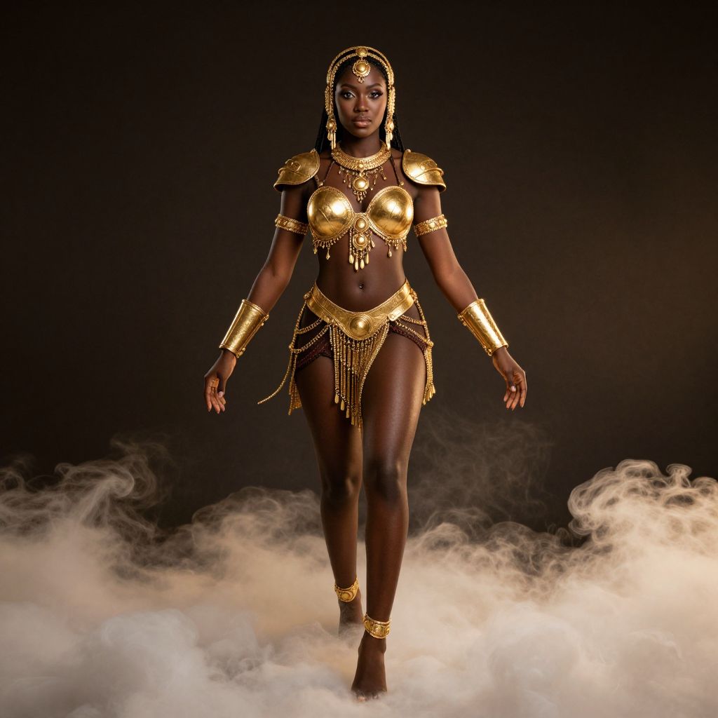 Photograph of a dark-skinned woman in golden ancient Egyptian-style armor and jewelry, walking through mist against a black background.