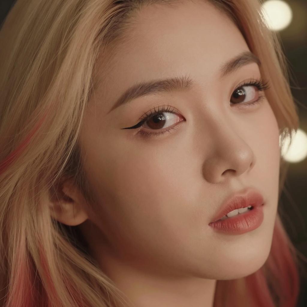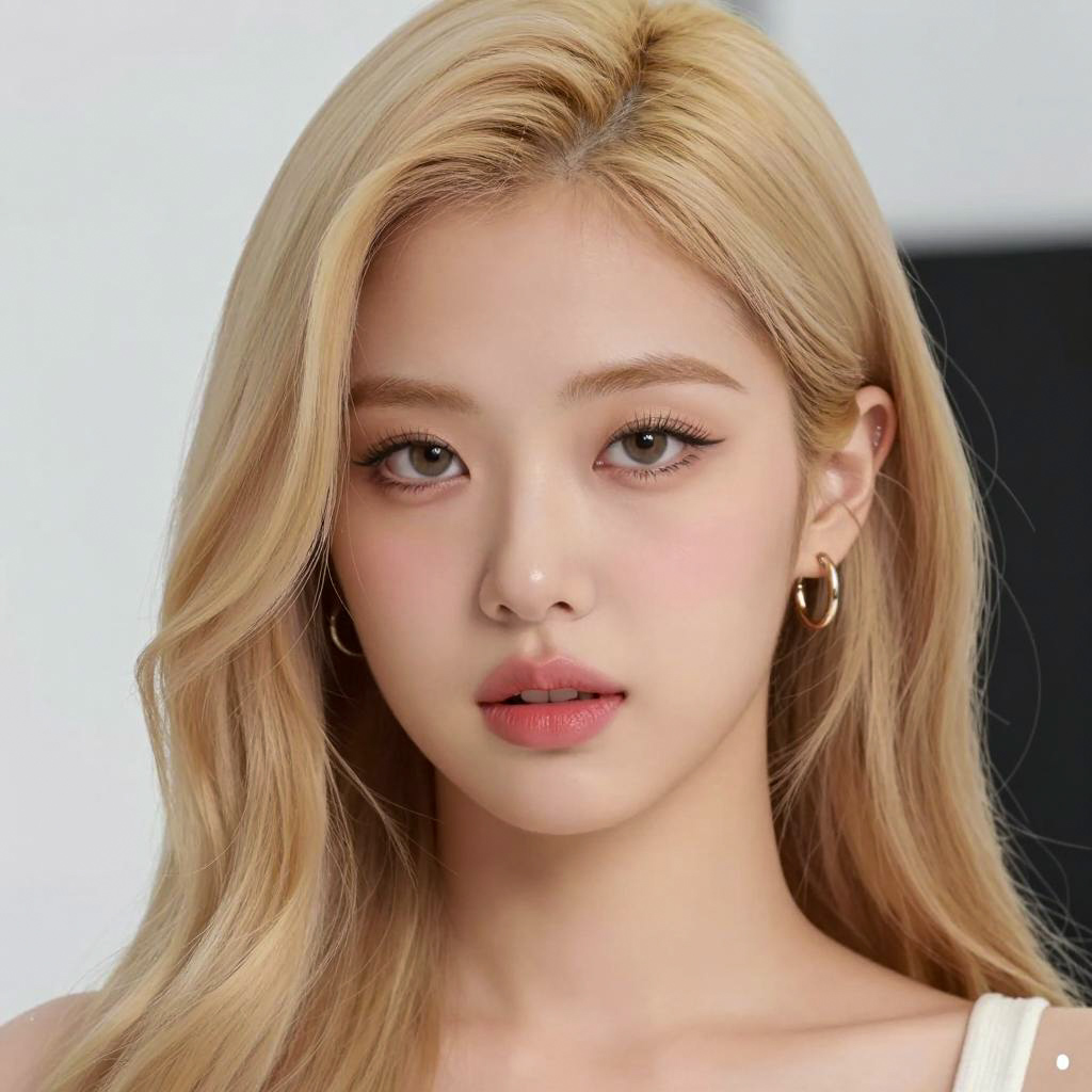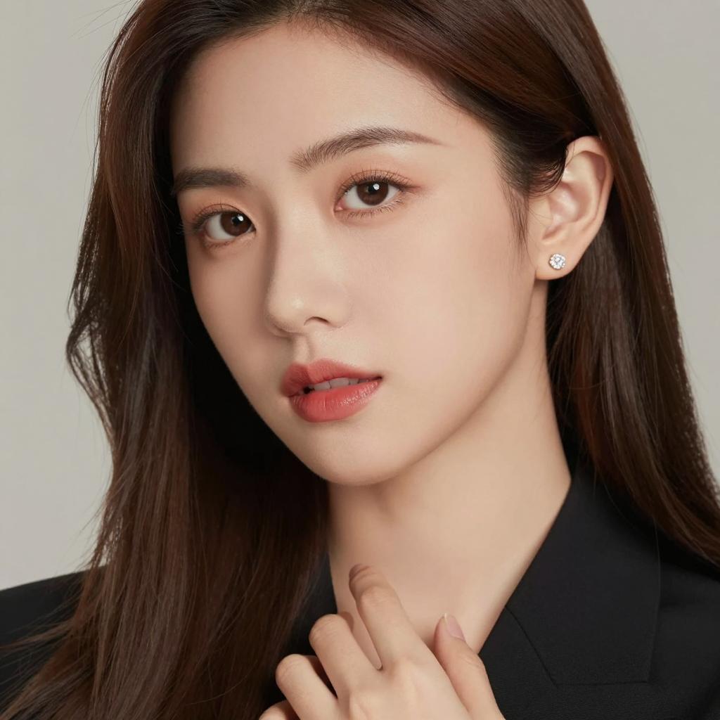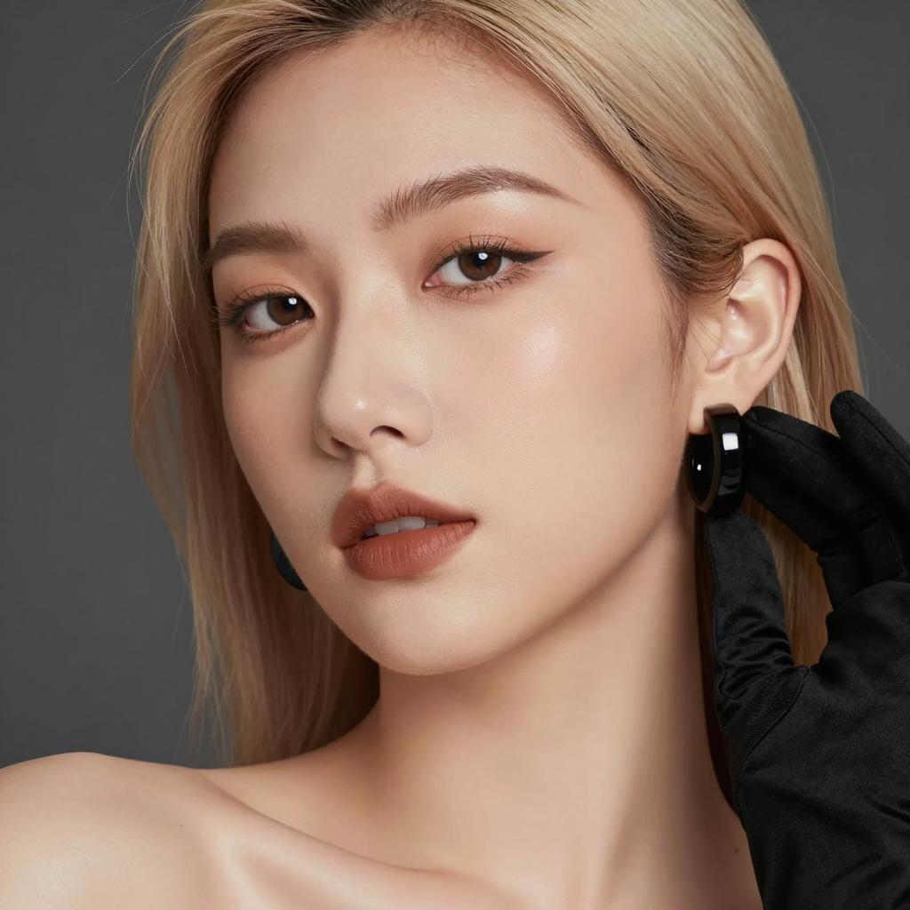 Close-up photograph of a woman with light blonde hair, dark brown eyebrows, dark eyeliner, and brown lipstick. She wears black, circular earrings and a black glove on her right hand, which is adjusting her earlobe. Her skin is smooth and glowing. The background is a solid, dark gray. Her visible eye is slightly open, looking forward. The woman's neck and upper chest are visible, showing a bare shoulder.