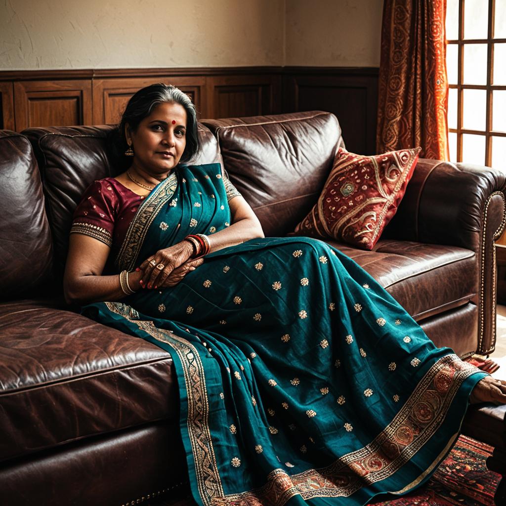 Middle-aged Indian Woman in Embroidered Saree Sitting on Leather Sofa