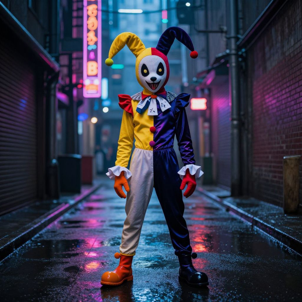 Photograph of a clown in a neon-lit, rain-soaked alley, wearing a jester mask, yellow and blue outfit, white ruffles