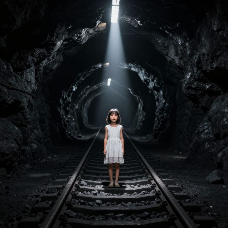"Minimalist Decor A Chinese little girl is sing in a huge coal mine.The mine is full of narrow rails. A beam of light shines down from the top of the mine. Extra Long Shot,tarkovsky film style,"