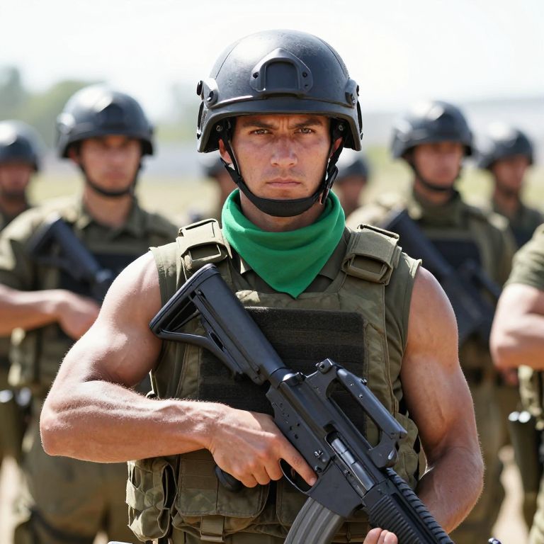 Photograph of a muscular, serious-looking soldier in the foreground, wearing a black helmet and tactical vest, with a green scarf around his neck. He's holding a black rifle, gripping it firmly. Behind him, a blurry group of similarly dressed soldiers stand in formation. The background is slightly out of focus, showing a bright, sunlit outdoor setting. The soldier's intense gaze is directed straight at the camera.