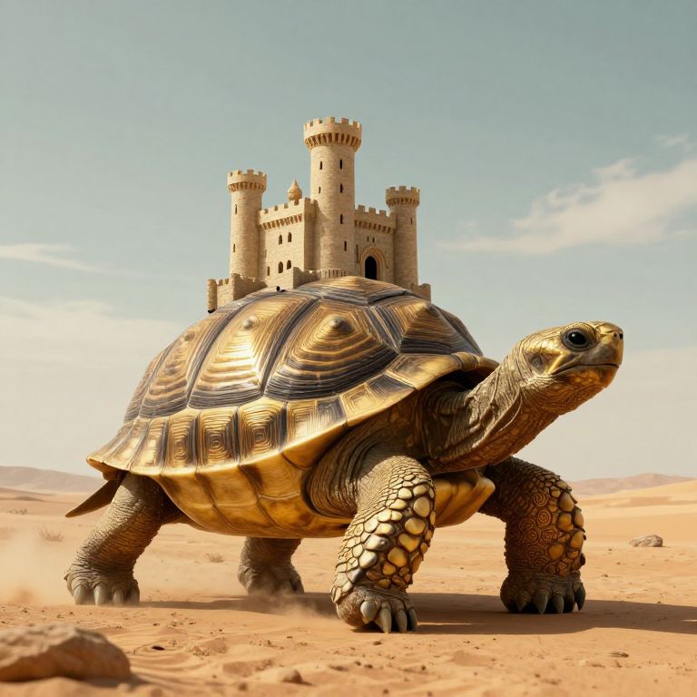 Digital artwork of a large, golden-tinted tortoise with intricate patterns, standing in a desert with a medieval castle in the background. Bright blue