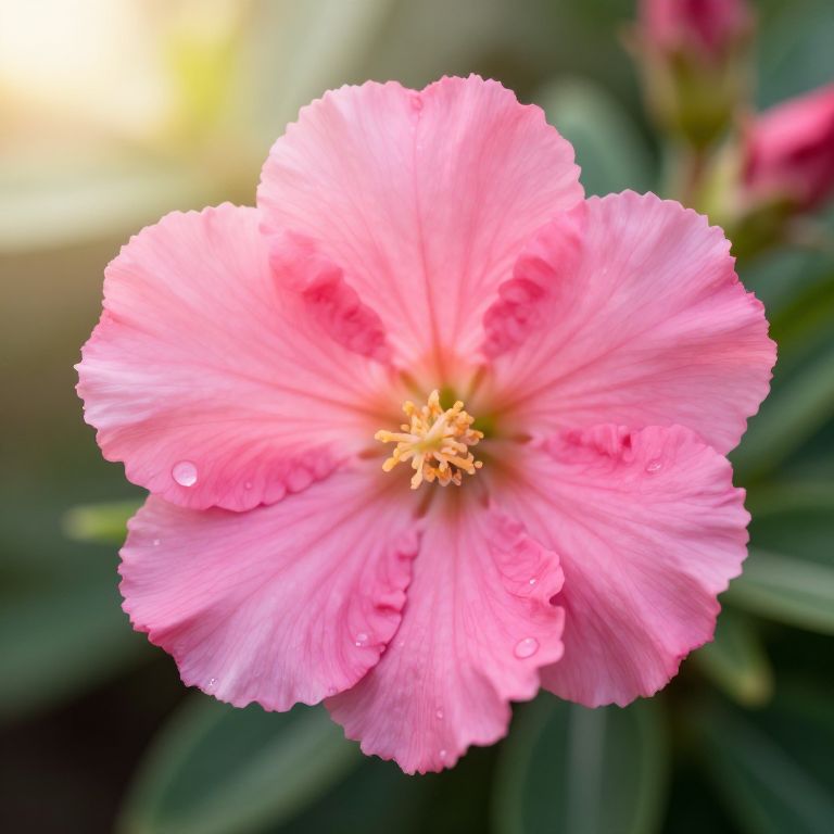 Spinato flower in full bloom, vibrant pink petals with subtle gradient, delicate water droplets on petals, soft morning sunlight, detailed botanical illustration style, shallow depth of field, natural garden background