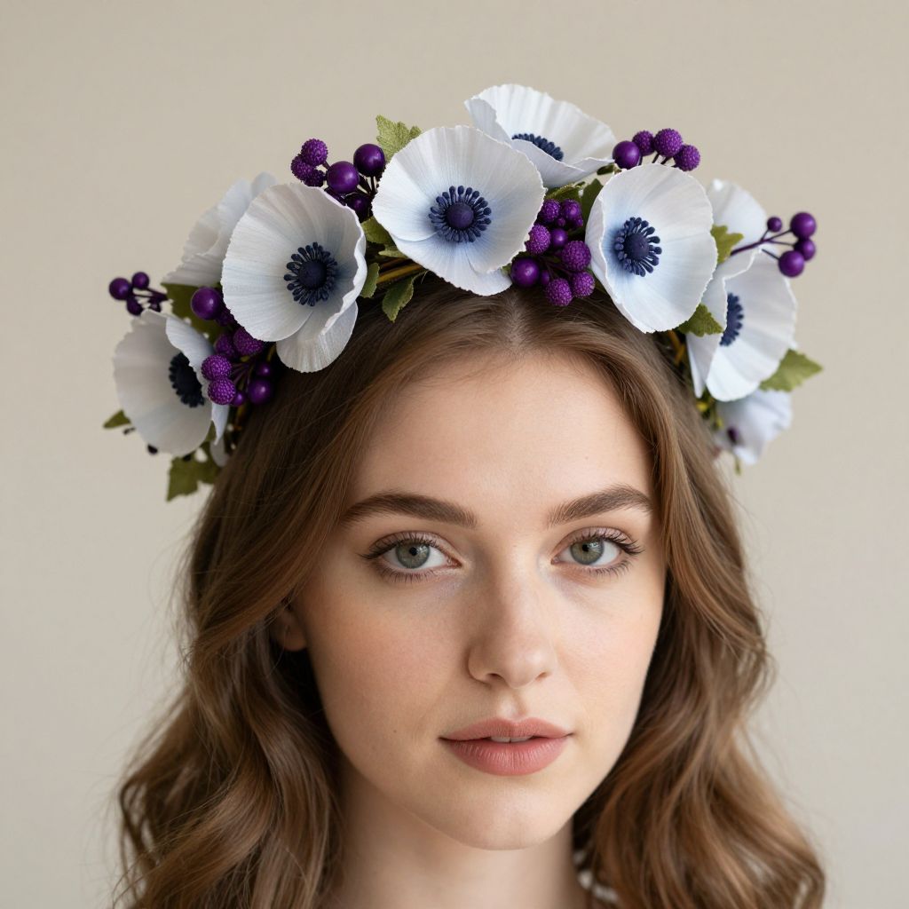 Close-up portrait of a young woman with light skin and wavy brown hair, wearing a vintage-inspired floral crown made of white silk poppies and vibrant purple berries. The elegant accessory is suitable for weddings, special occasions, or festive celebrations, set against a neutral background.