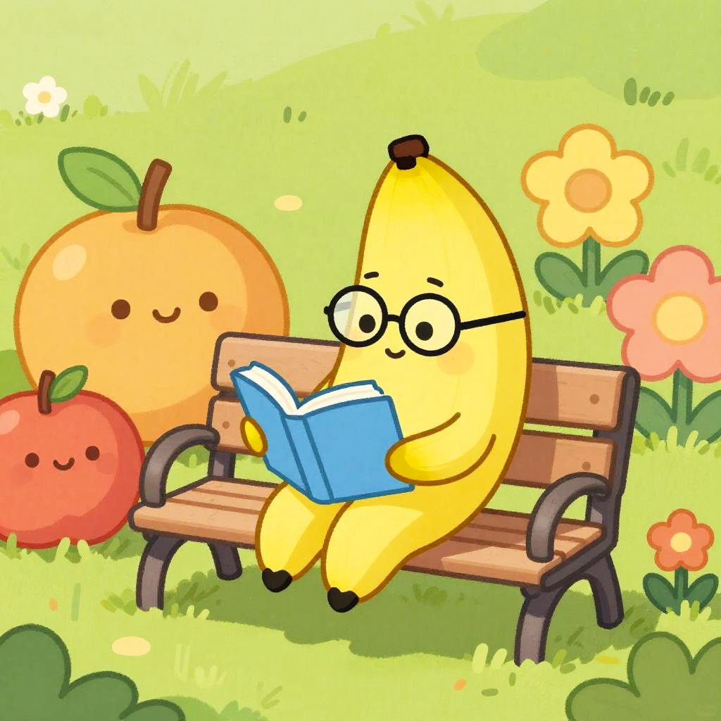 A whimsical illustration of a bananai character wearing tiny glasses and reading a book, sitting on a park bench surrounded by oversized colorful fruits and flowers, rendered in a playful cartoon style.