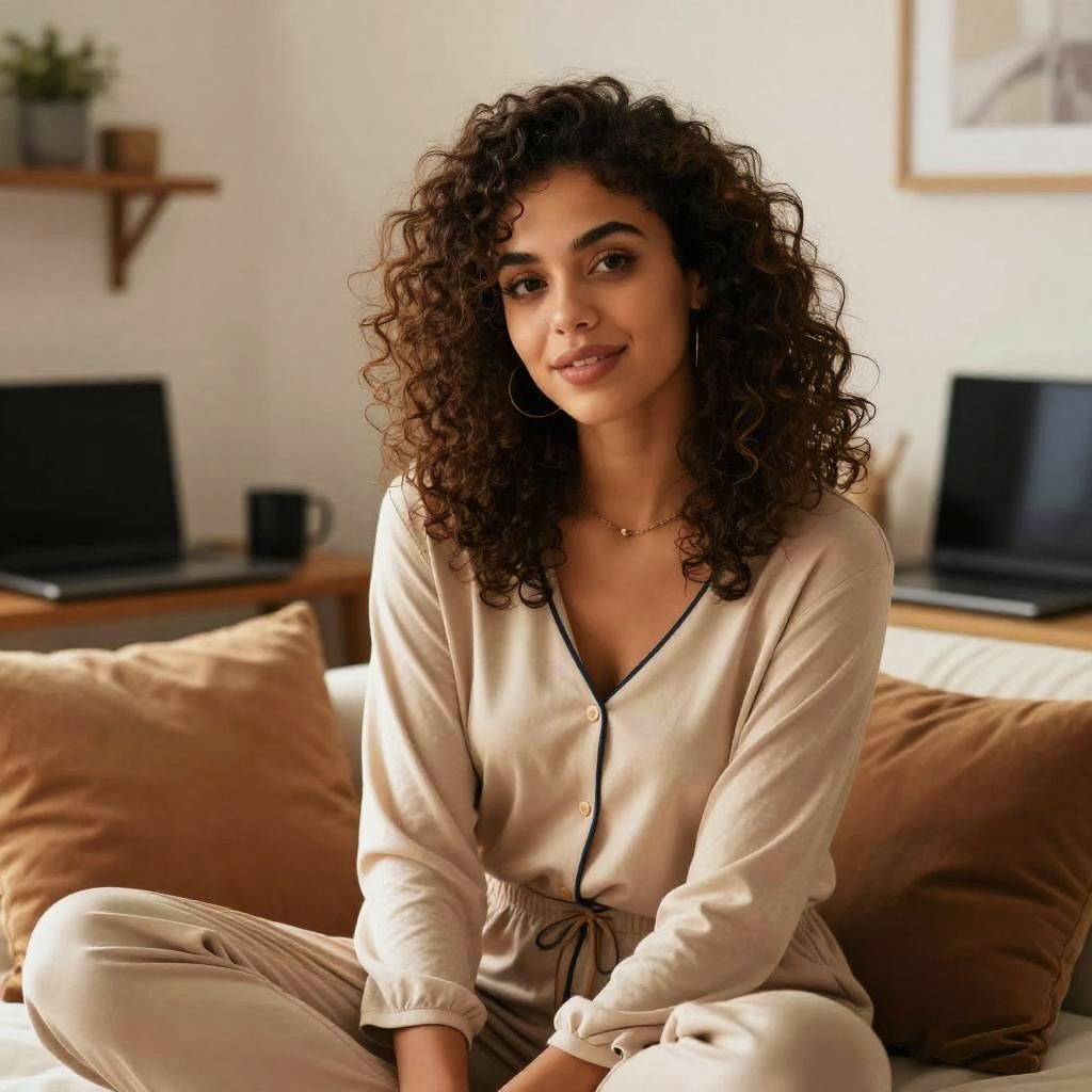 Curly hair OnlyFans creator in a cozy, softly lit room with warm tones, wearing stylish loungewear, looking confident and approachable, natural makeup highlighting her features, surrounded by subtle tech gadgets and plush cushions, inviting and intimate atmosphere.