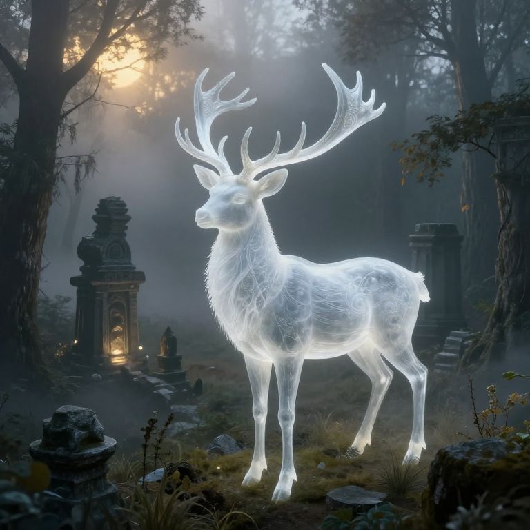 A surreal dreamscape showcases a majestic white stag with intricately spiraling antlers standing tall amidst a misty, moonlit forest. The ethereal creature appears to be made entirely of delicate glass, its translucent form casting an otherworldly glow over the surrounding trees. From an aerial perspective, we see the ghostly outlines of ancient stone structures hidden beneath the undergrowth, hinting at a forgotten civilization lost in time. As soft golden light filters through the dense fog, it illuminates these mysterious ruins, creating a captivating visual narrative that evokes feelings of awe, wonder, and a touch of melancholy.